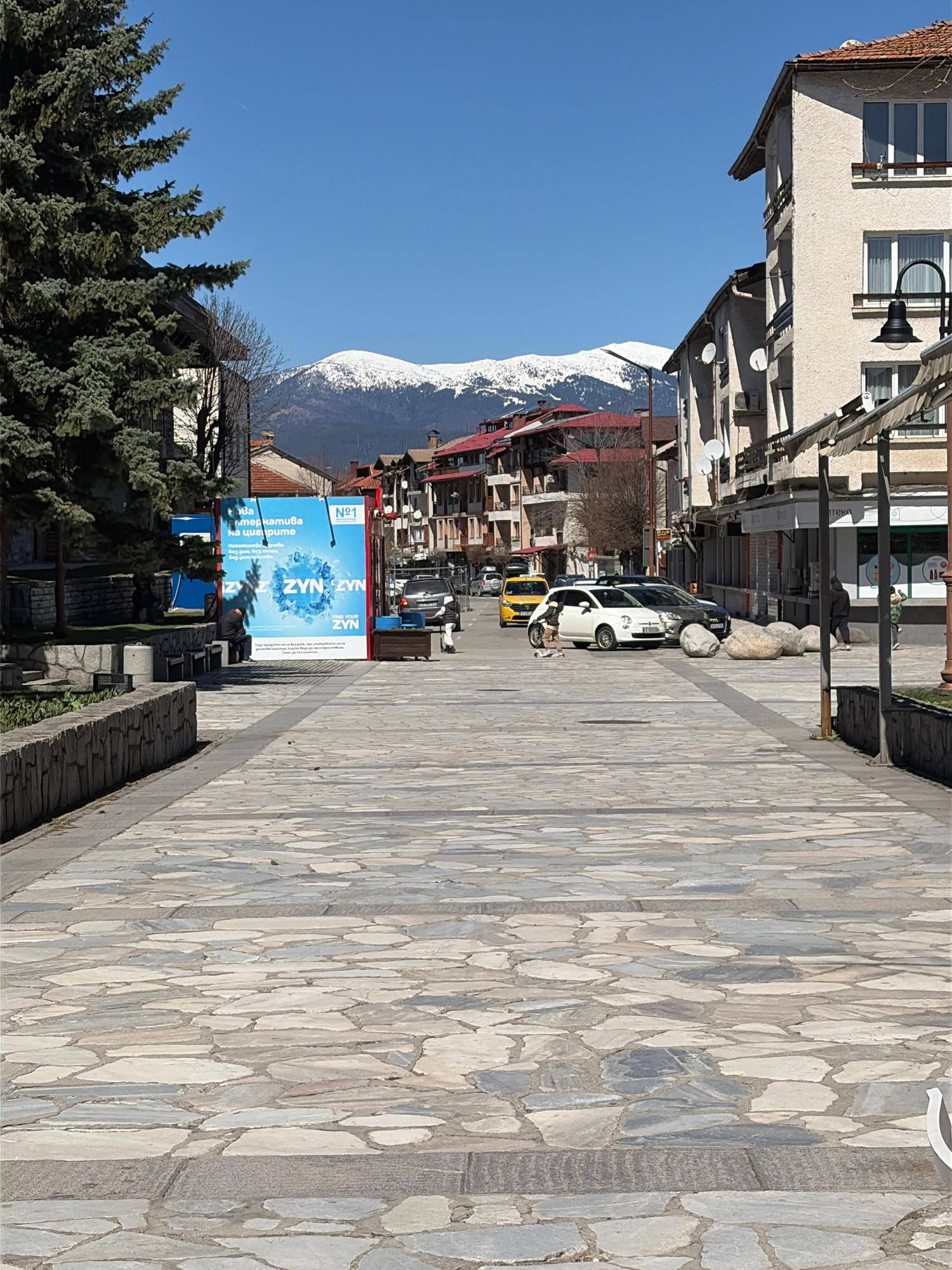 The image depicts a street scene in Bansko, Bulgaria, characterized by a cobblestone pavement that occupies the foreground. A row of buildings lines the left side of the street, interspersed with ever…read more
