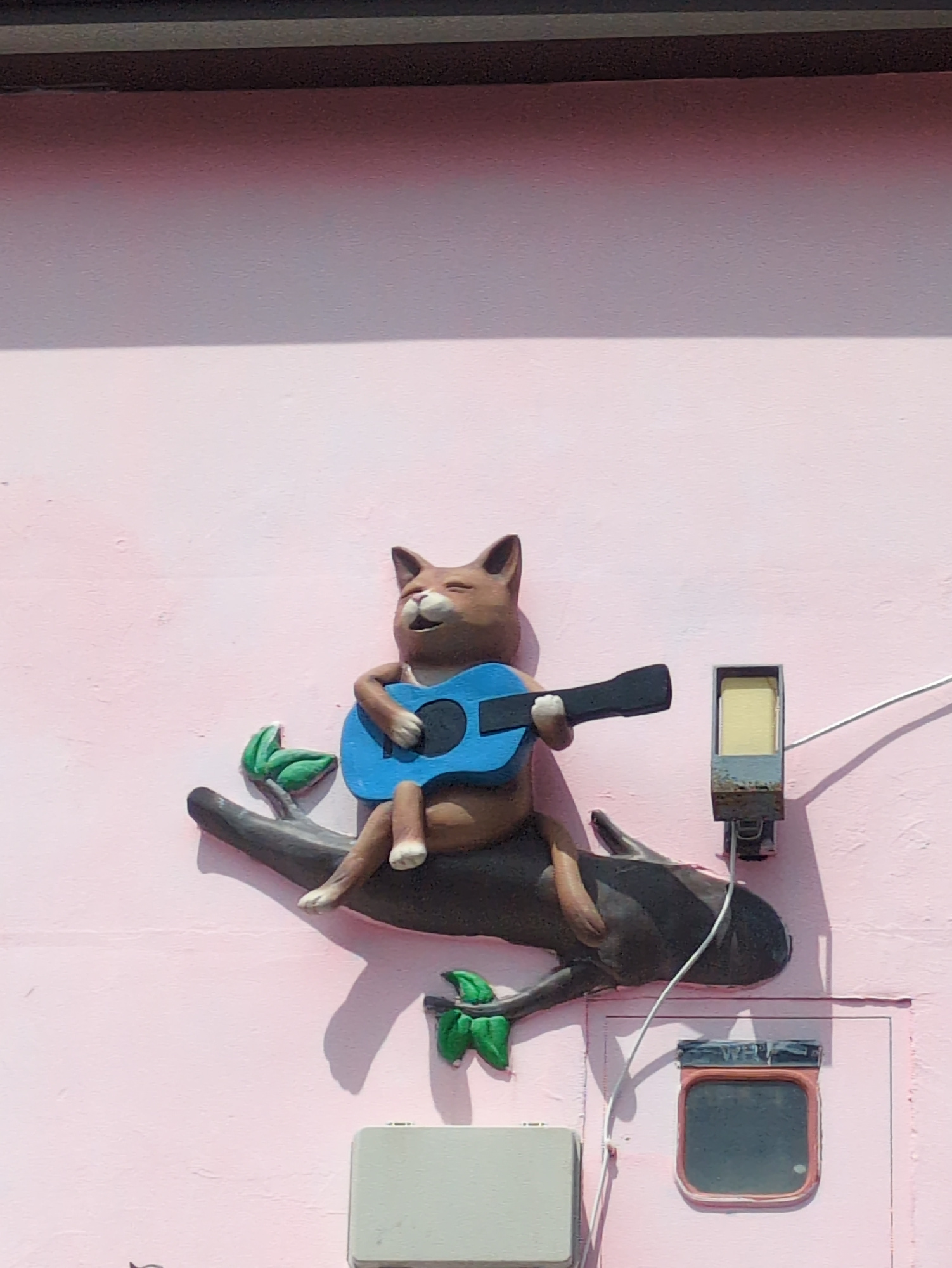A low-angle, full outdoor shot captures a piece of whimsical wall art in Busan, South Korea. The pink wall is adorned with a 3D sculpture of a brown cat playing a blue guitar while clinging to the sid…read more