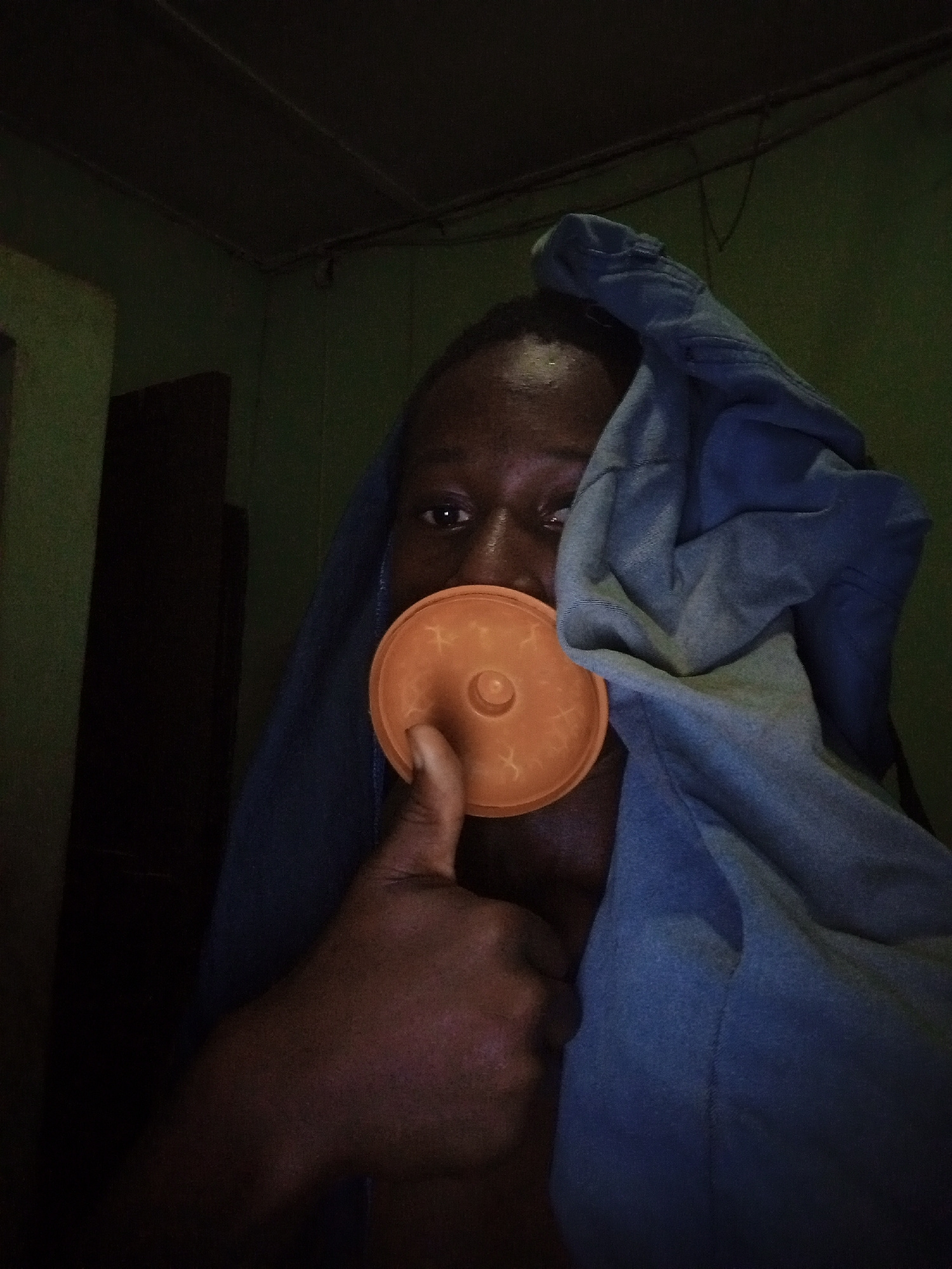 An individual stands indoors, with a blue fabric draped over their head and shoulders, and holding a circular orange object over their mouth. The individual's right thumb is extended upwards, giving a…read more