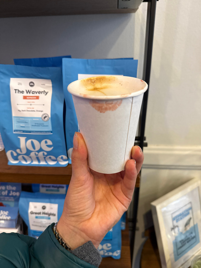 The image displays a close-up shot of a right hand holding a white disposable coffee cup, set against a background of branded coffee bags and shelves. The image appears to be rotated clockwise, making…read more