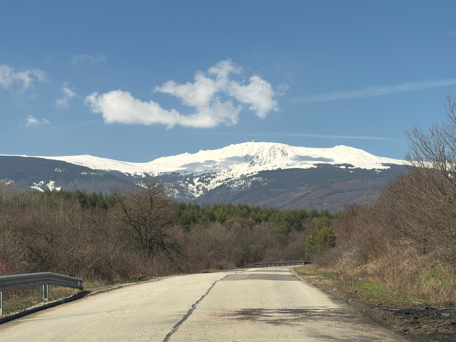 The image shows a paved road leading toward a mountain range with snow-covered peaks. The road has a prominent crack running down the center and some areas of patching. A metal guardrail is visible on…read more