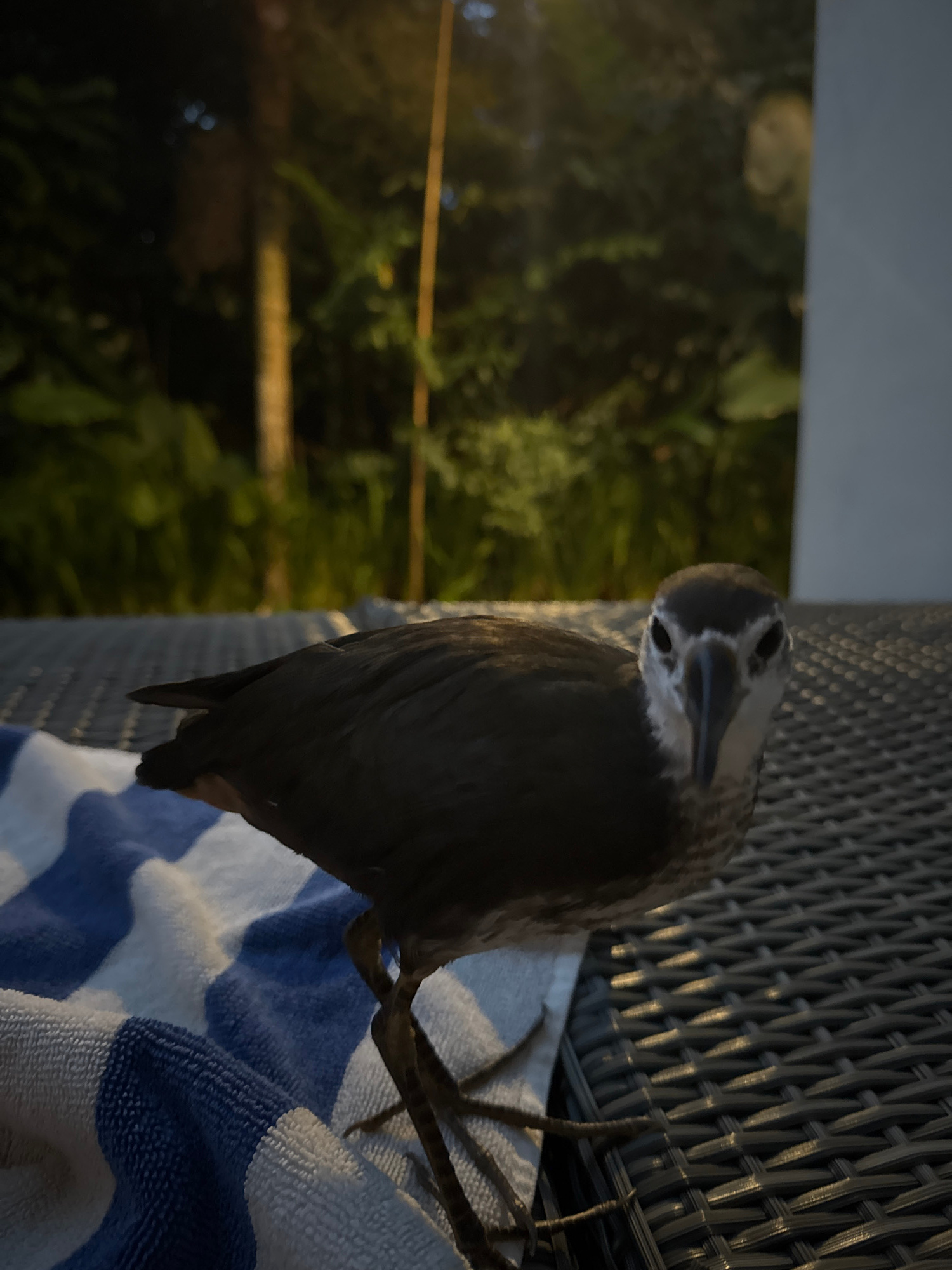 A gray and white juvenile striated heron (Butorides striata) stands on a blue and white striped towel draped over gray wicker furniture. The bird’s head is cocked and angled downward. Dark green veget…read more