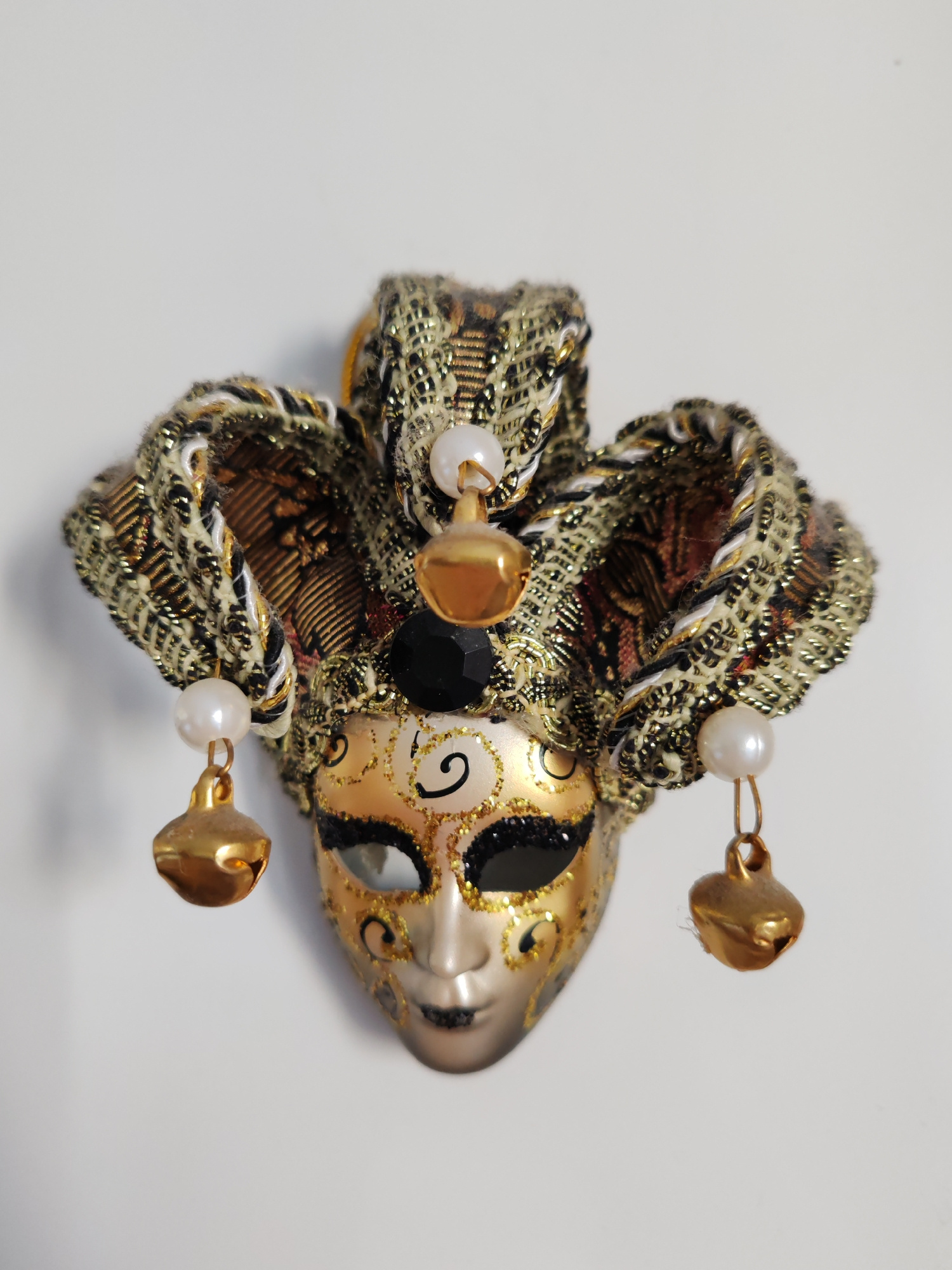 The image features a richly detailed Venetian-style jester or joker mask, displayed against a plain white background. The mask's face is predominantly gold and light beige, with one eye socket detaile…read more