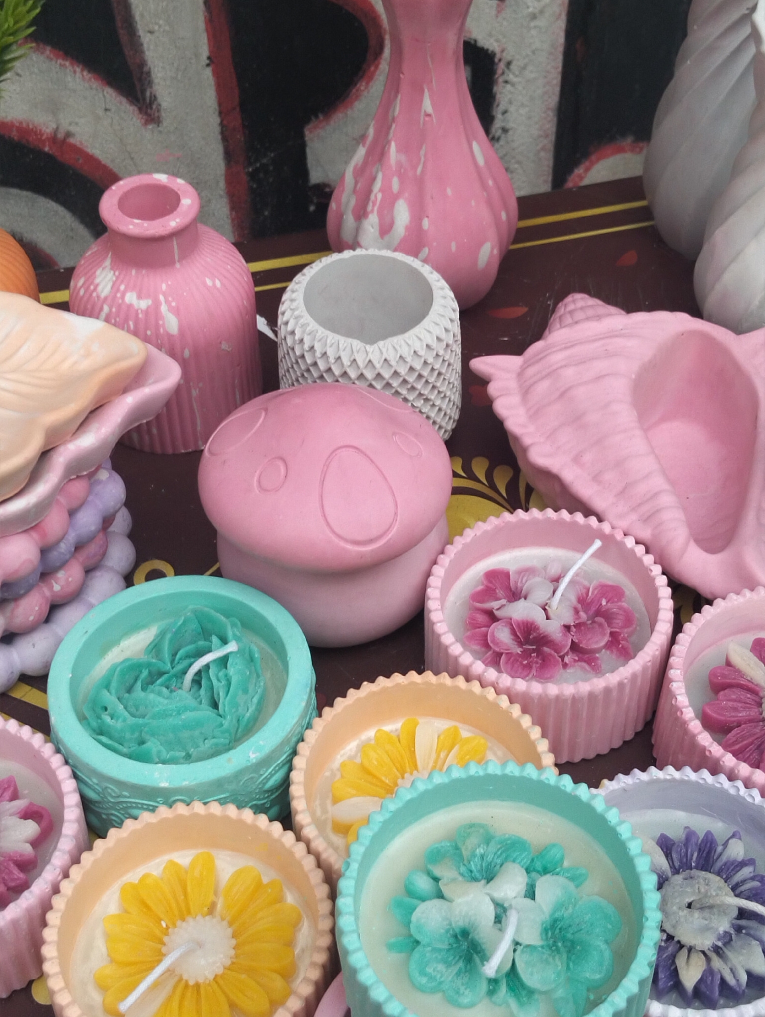 The image depicts a tabletop display of decorative items, including vases, small containers, and flower-shaped candles in pastel colors. The candles are arranged in circular containers with scalloped…read more