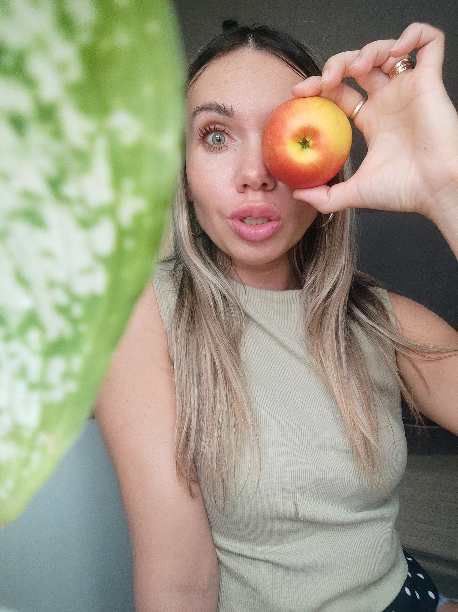 A young adult woman with fair skin, long blonde hair, and light-colored eyes is posing for a selfie. She is holding a small, red and yellow apple over her right eye. She has several rings on her right…read more