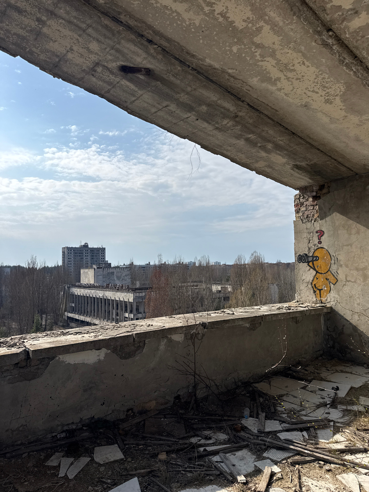The image shows a view from within a dilapidated building in Prypiat, Ukraine. The decaying concrete structure frames the exterior view, showcasing other ruined buildings against a pale blue sky with…read more