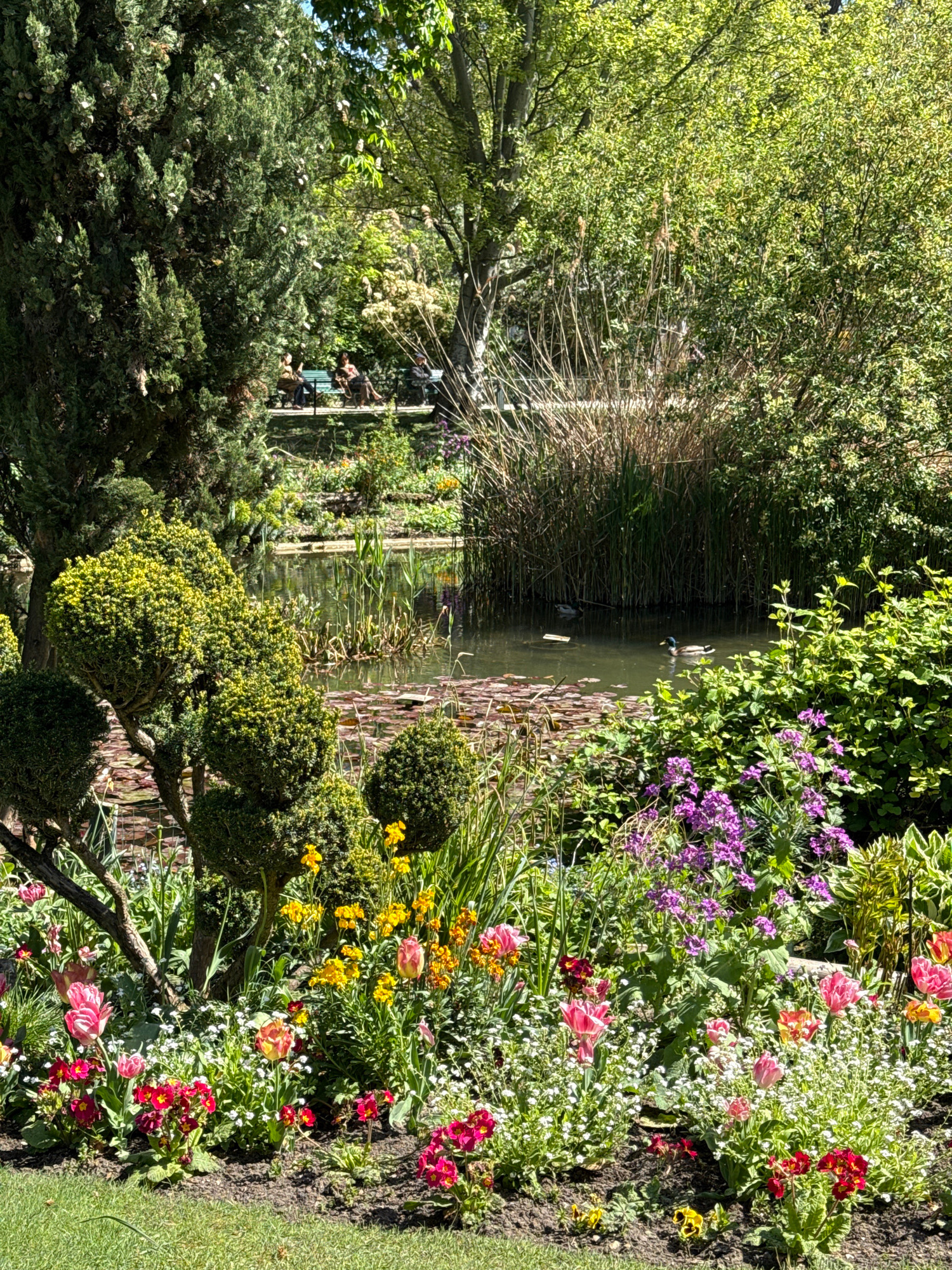 The image depicts a tranquil garden scene, likely located in Paris, France. A pond takes center stage, its surface reflecting the surrounding vegetation. Lily pads dot the water, and reeds line the ed…read more