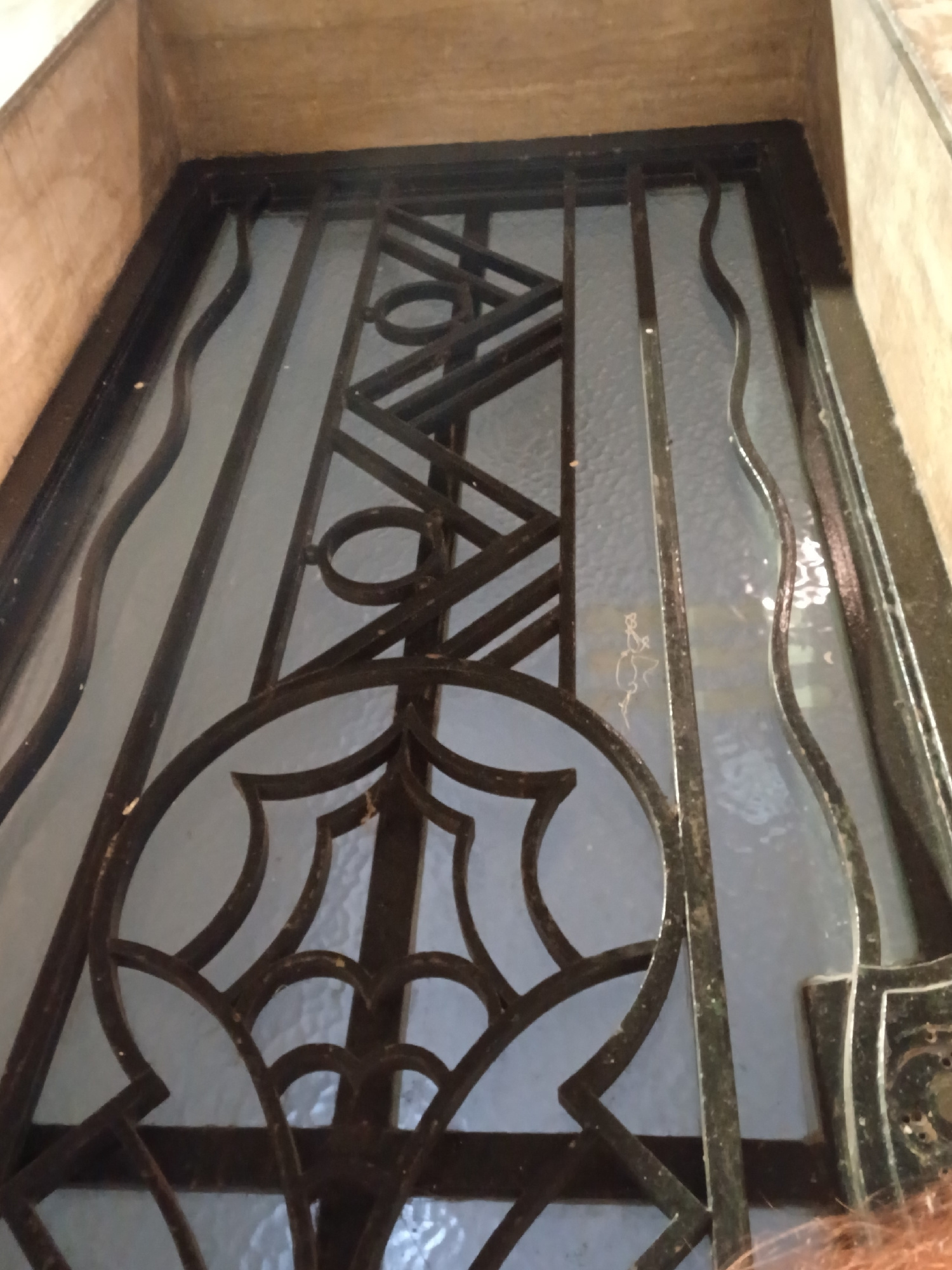 This close-up image showcases a section of a window or decorative panel, featuring a dark, intricate metal grill set against a textured, translucent glass pane. The scene is likely from a building in…read more