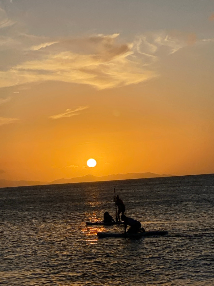 The image captures a sunset over a body of water in Juan Griego, Venezuela. The horizon is visible, separating a heavily orange and yellow-hued sky from the dark blue water. The sun, a bright, circulaβ¦read more