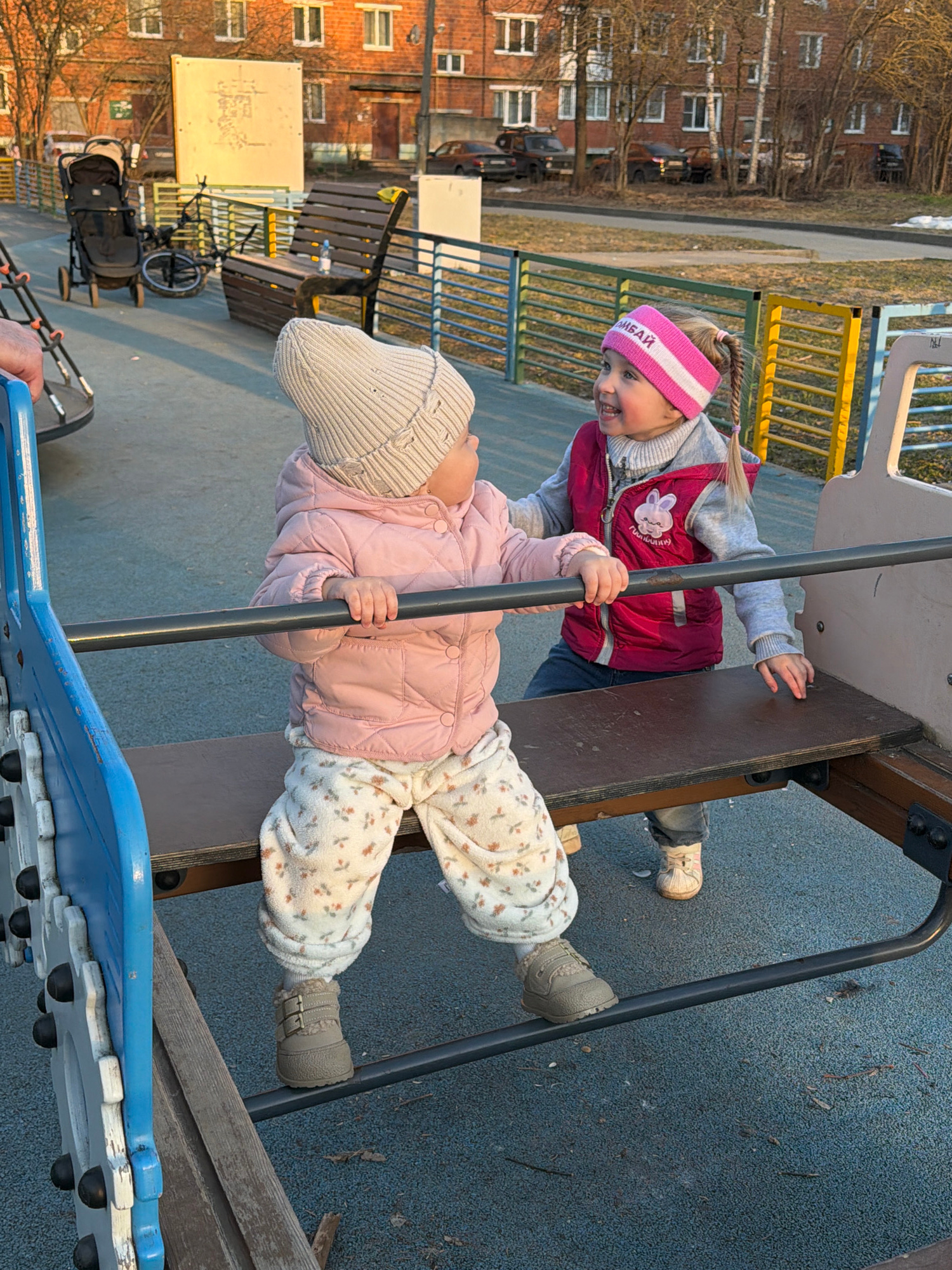 Two young children are playing on playground equipment in Reshetnikovo, Russia. The child on the left is wearing a pink coat, floral pants, a knit hat, and grey boots, and is holding onto a black meta…read more