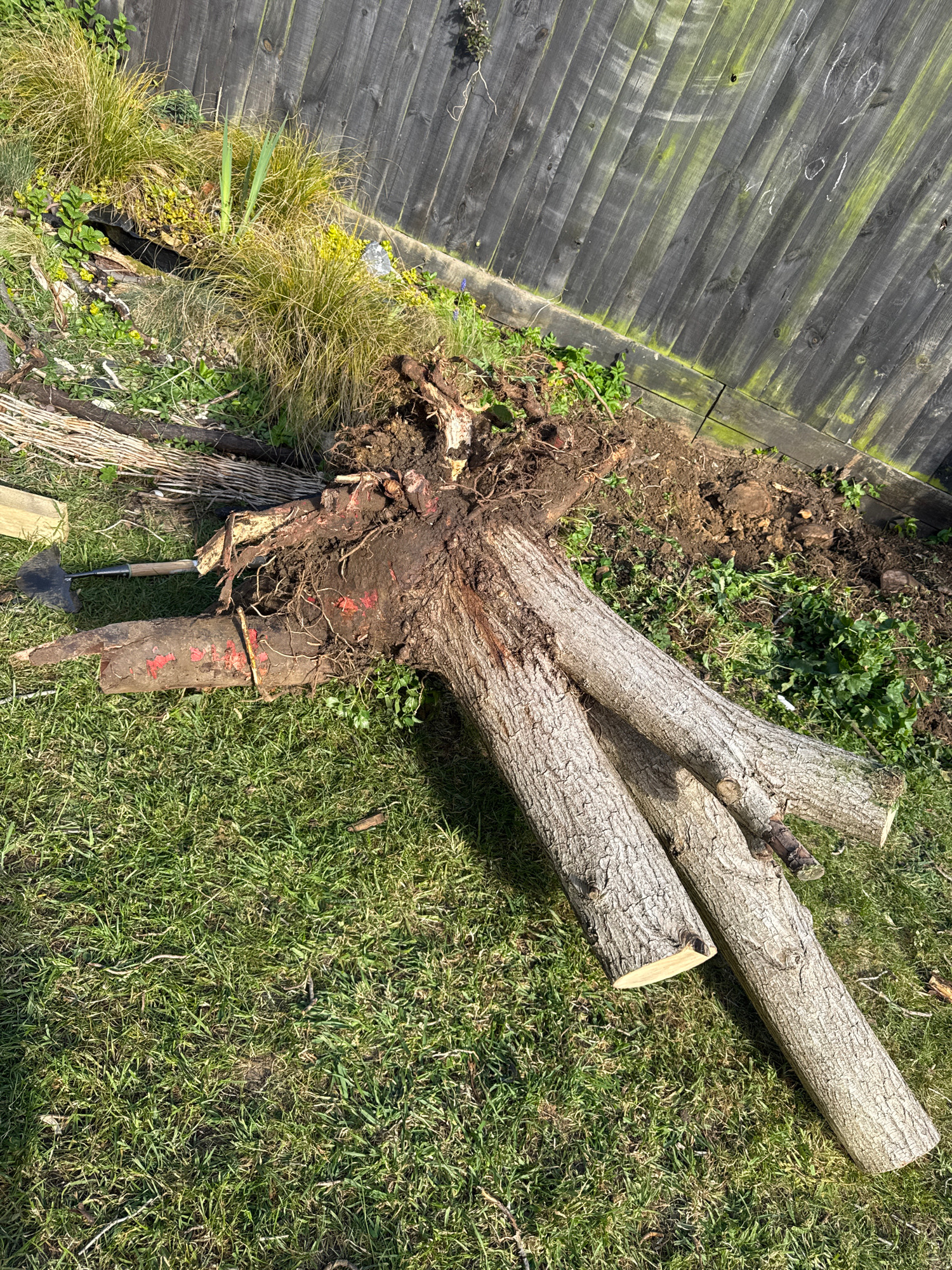 The image depicts a recently uprooted tree lying on a grassy lawn in South Kesteven, United Kingdom. The tree has been felled, with three cut logs extending from the main trunk. The roots are exposed…read more