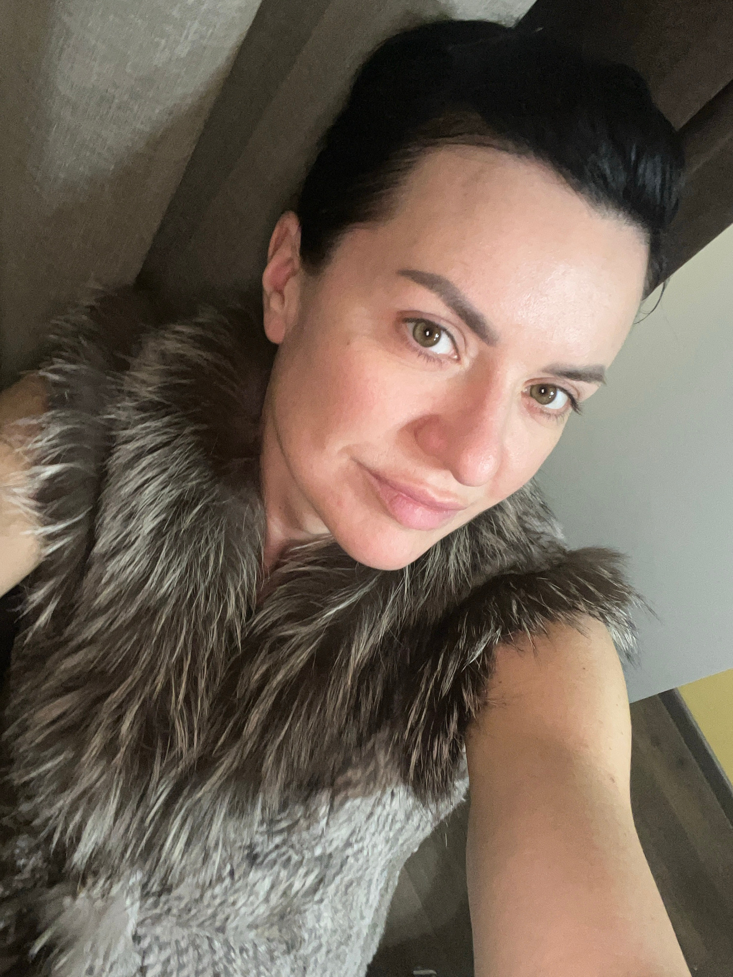 A medium-close shot depicts a woman wearing a grey and brown fur vest. She has short, dark hair pulled back from her face. Her skin appears fair, and her eyes are light brown. She is looking directly…read more