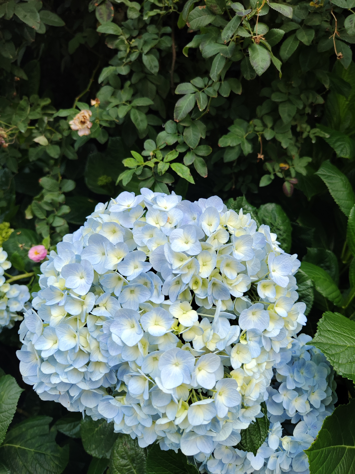 A close-up shot focuses on a lush blue hydrangea bloom nestled amongst greenery. The hydrangea is a dome of densely packed individual florets, each a soft blue with a pale yellow center. The surroundi…read more