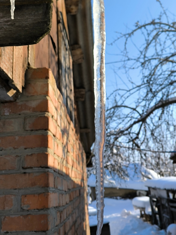 A long, clear icicle, approximately 60-70 cm in length, hangs vertically from the eaves of a brick building in Parkhomivka, Ukraine. The icicle exhibits ridged sections and reflects sunlight. To the lā¦read more