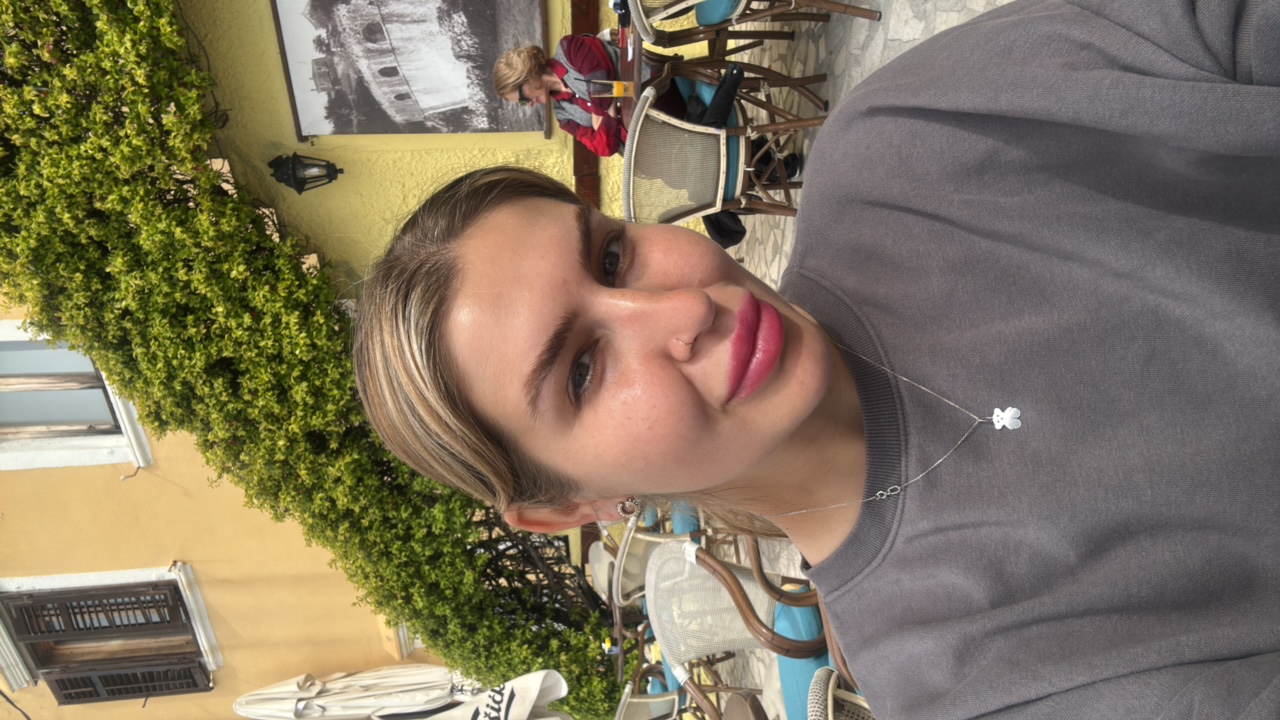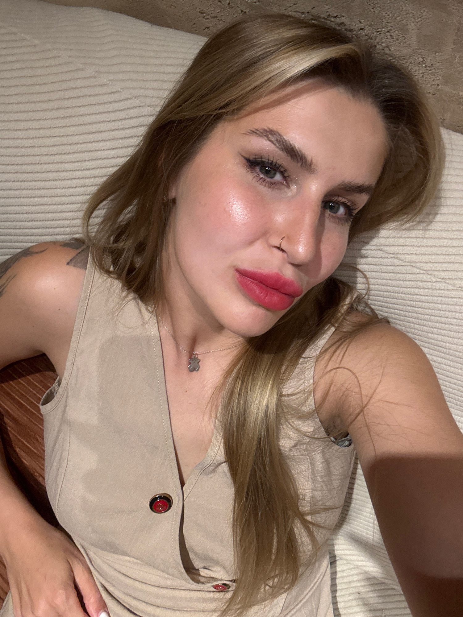 A woman with blonde hair and red lipstick lies on a white, textured surface, wearing a beige sleeveless dress with red buttons. She has a nose ring and a silver necklace with a small pendant. A tattoo…read more