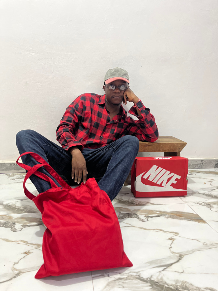 A person sits with crossed legs, wearing blue jeans and a red and black checkered shirt. They have glasses and a gray hat. A red tote bag rests on their lap. Behind them is a wooden stool supporting a…read more