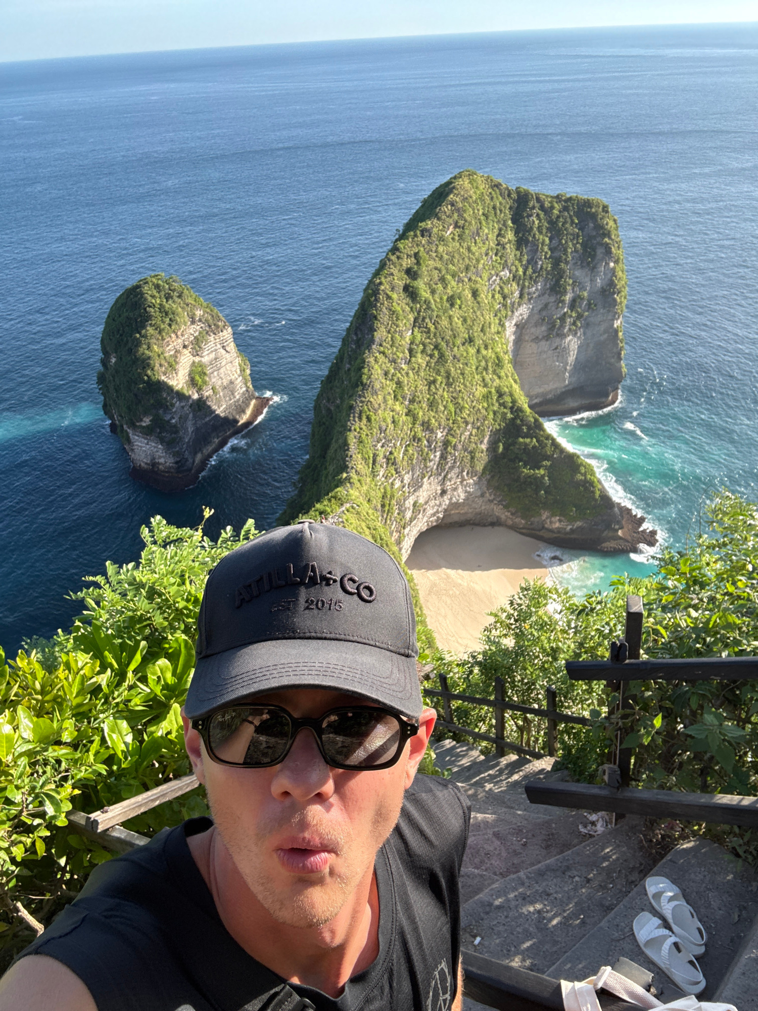 A man is taking a selfie at Kelingking Beach in Nusa Penida, Indonesia. The ocean and the island are in the background. There is a set of stairs to the right of the man with a pair of sandals.