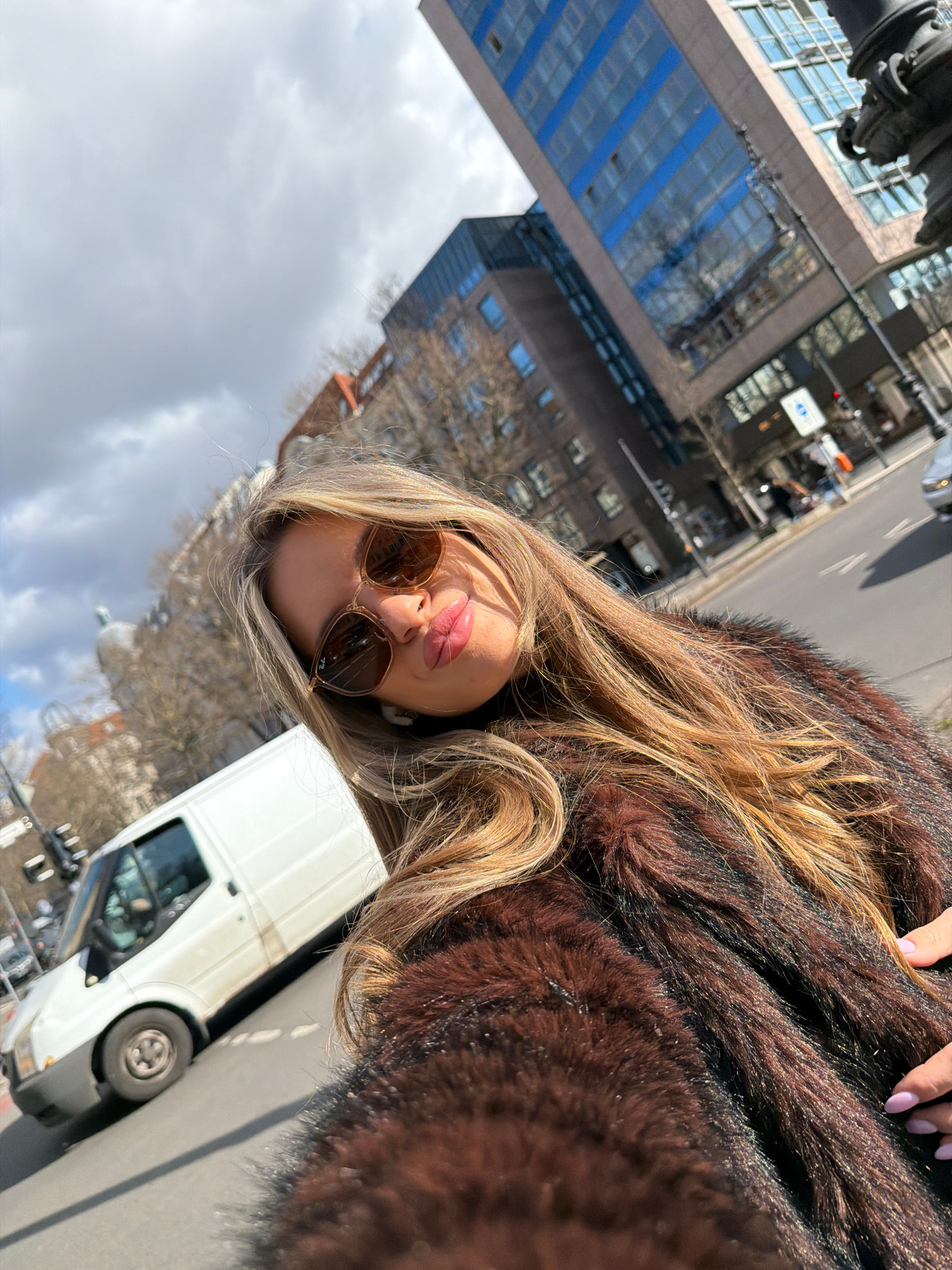 A woman with long blonde hair and sunglasses, wearing a brown fur coat, takes a selfie in an urban environment. A white van is parked on the side of the road. Buildings are visible in the background,…read more
