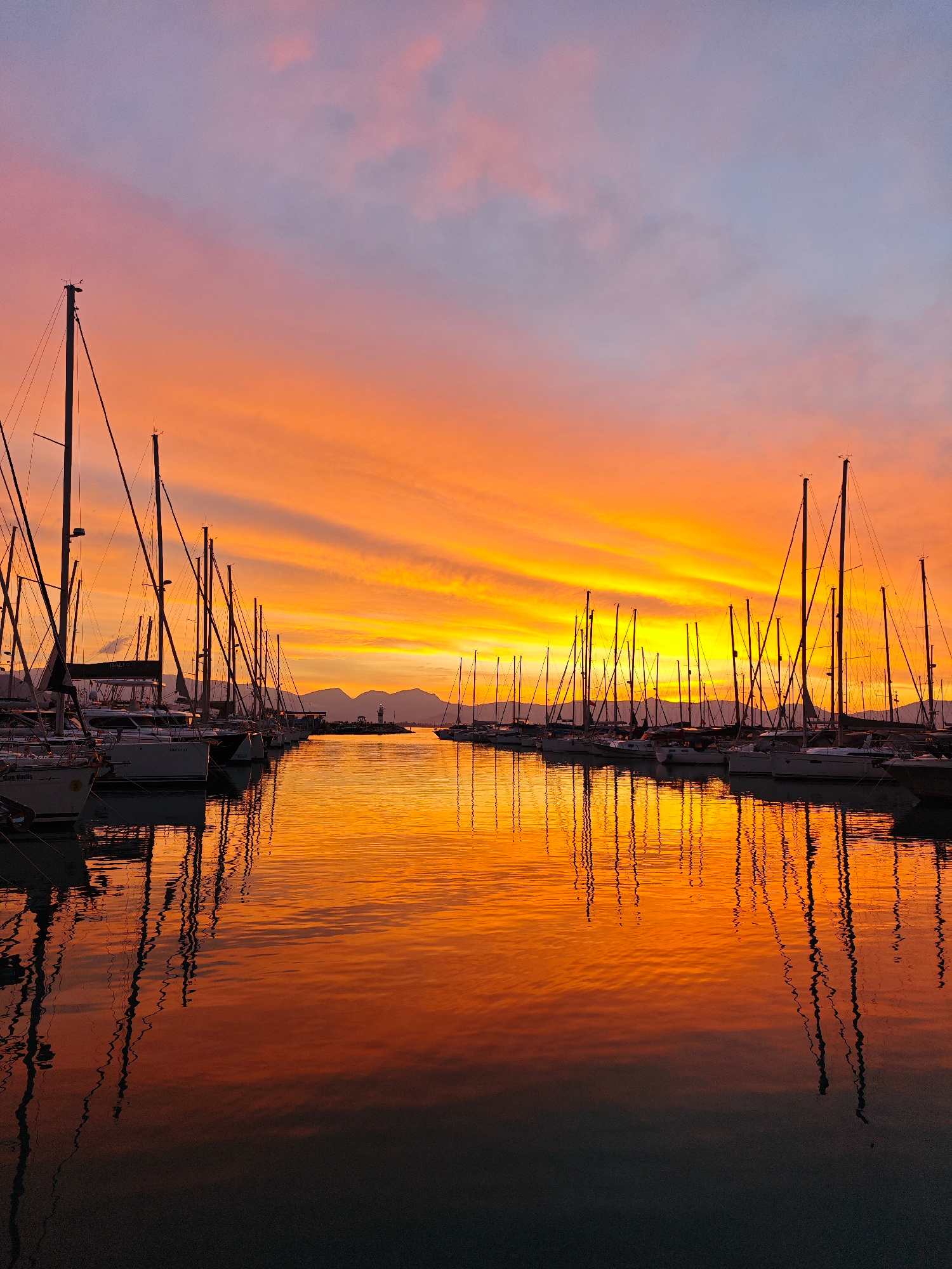 The image captures a serene scene at the marina of Finike, Turkey, during a vibrant sunset. Rows of sailboats are docked on either side of a waterway, their masts reaching towards the sky. The setting…read more