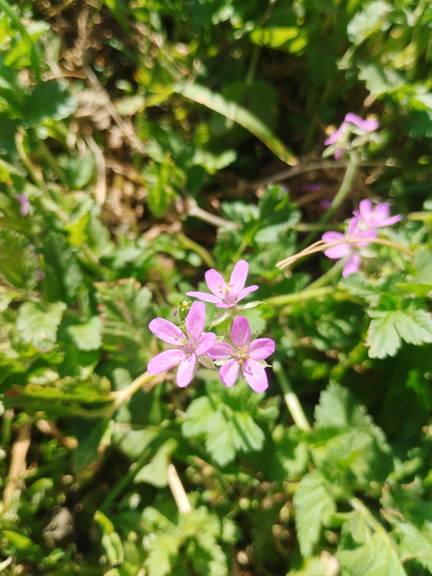 A vibrant, close-up photograph captures a cluster of small, delicate pink-purple wildflowers set against a lush, green, and heavily blurred background. Three main flowers are in sharp focus in the low…read more