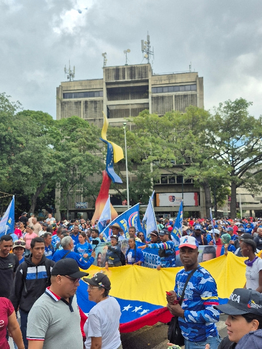 A large crowd gathers, many wearing blue and holding Venezuelan flags. A very long Venezuelan flag is prominently displayed. Buildings and trees are visible in the background. The sky is overcast.