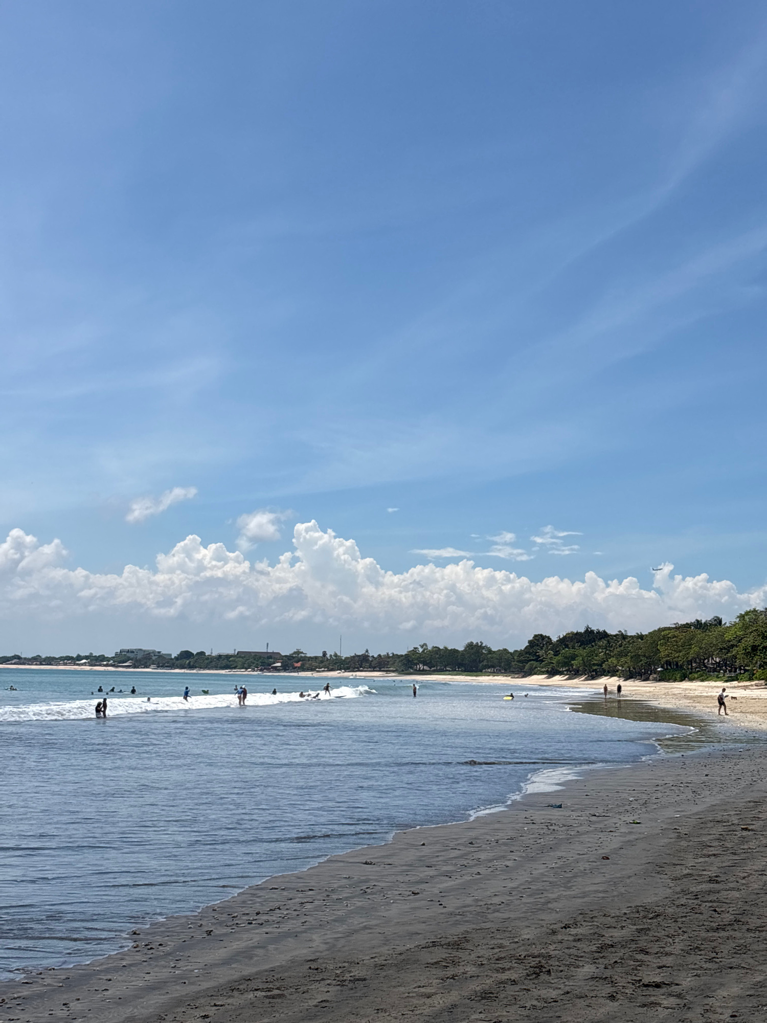 The image depicts a beach scene in Kuta Selatan, Indonesia. The sky is predominantly blue with some wispy clouds and a line of larger, cumulus clouds near the horizon. The beach stretches across the r…read more