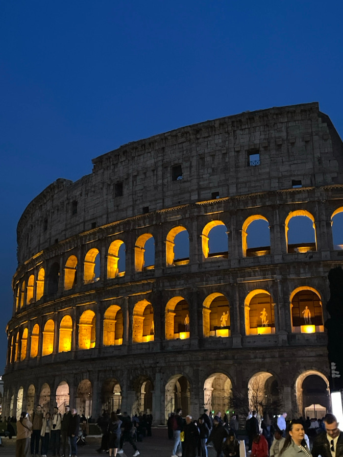 The image displays the ancient Roman Colosseum in Rome, Italy, at night. The structure's lower and middle tiers of arches are illuminated with a warm, golden-yellow light, contrasting with the unlit u…read more
