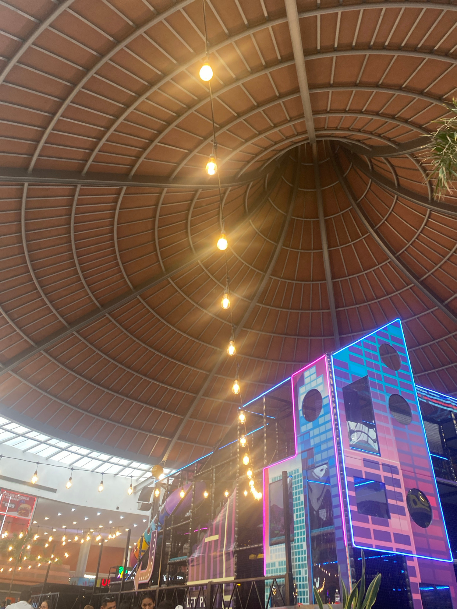 The image depicts the interior of the Sambil Margarita mall in Pampatar, Venezuela. The distinctive architectural feature is a large, conical structure that resembles a funnel or vortex, likely part o…read more