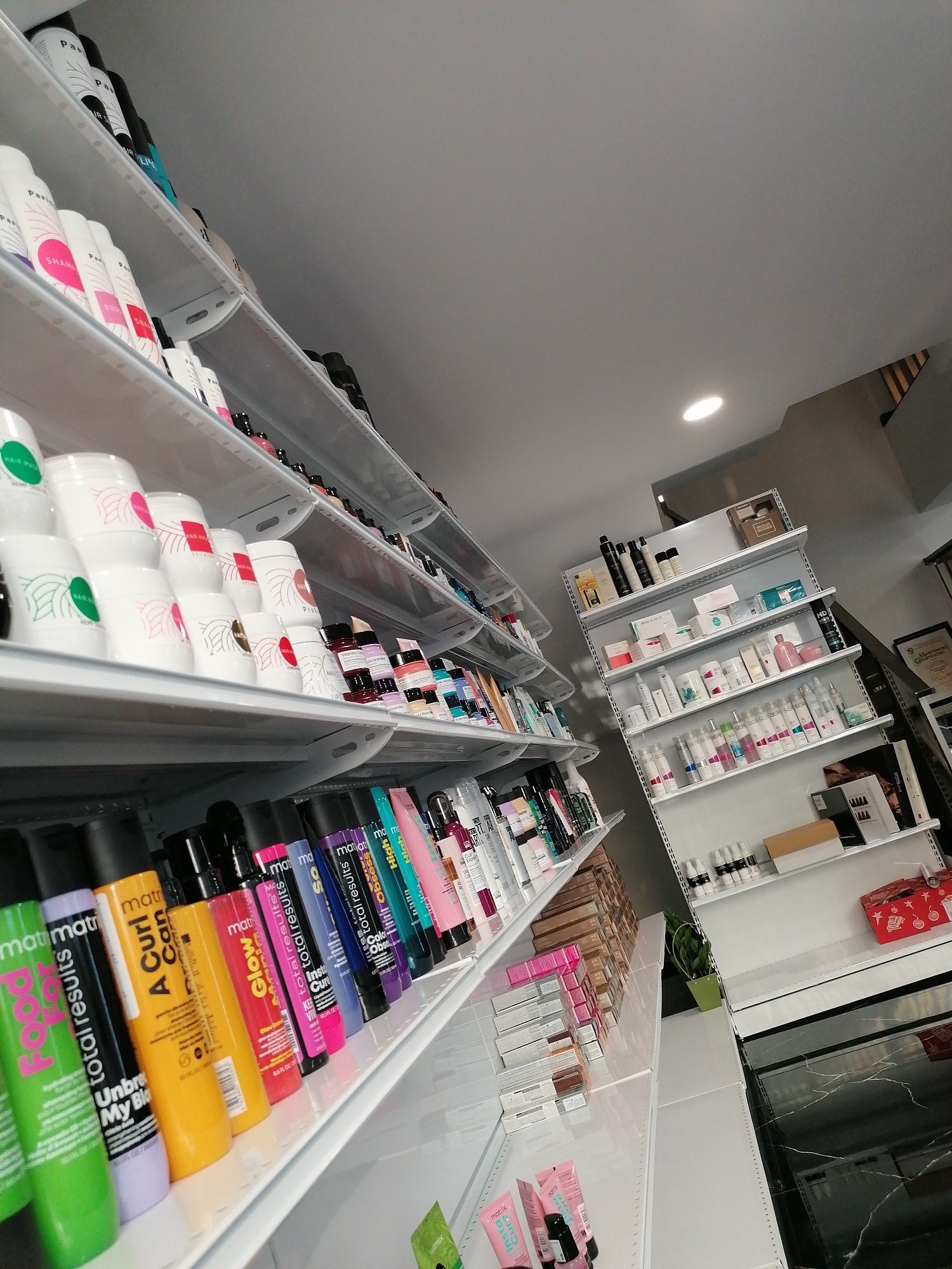 The image depicts a well-lit retail space in Kazanlak, Bulgaria, possibly a beauty salon or cosmetics store. Multiple shelves are filled with various haircare products, including brands like "Matrix"…read more