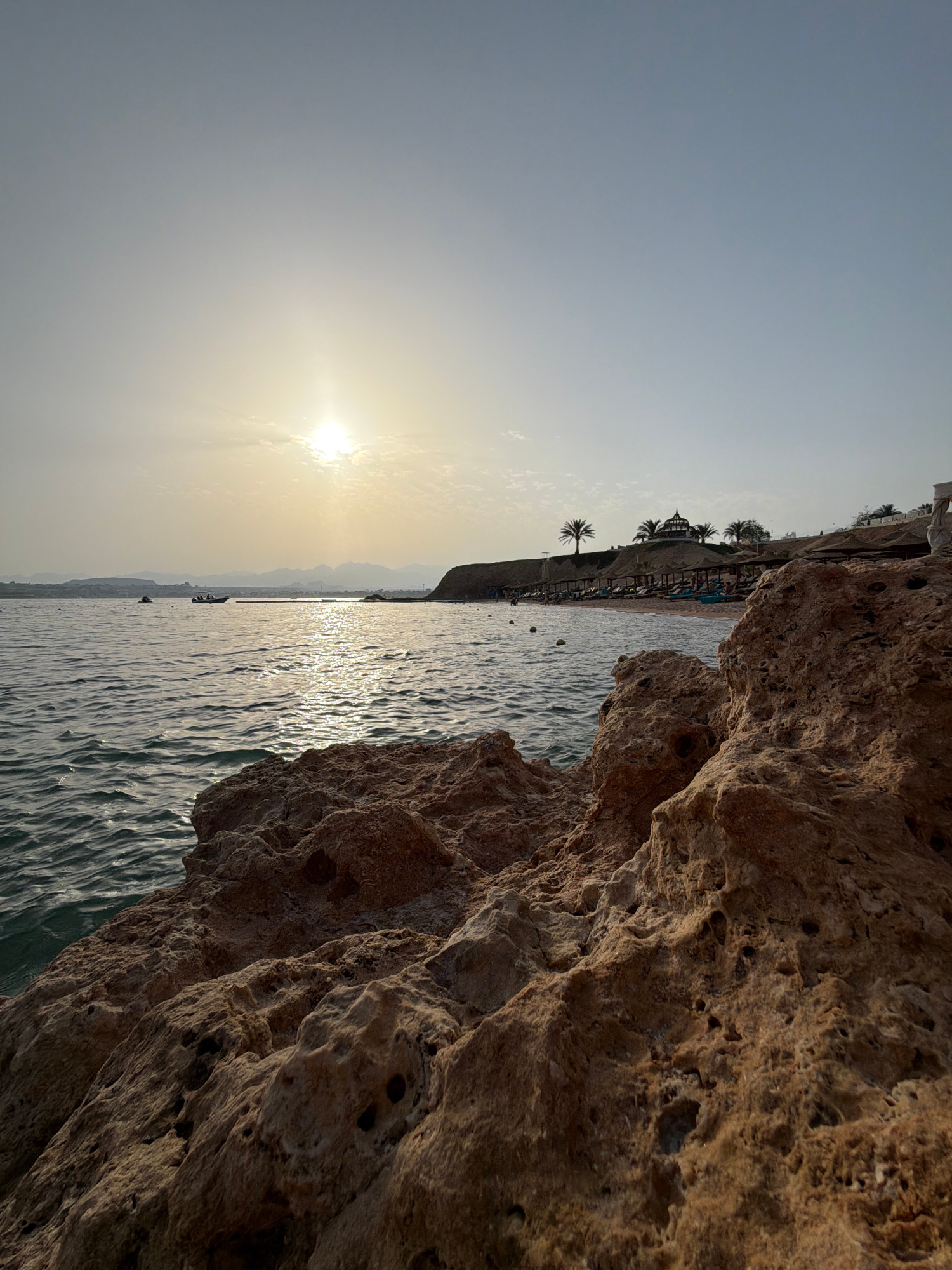 The image captures a coastal scene in Sharm El Sheikh, Egypt. The perspective is from within a rocky outcrop, with the textured rock formation occupying a significant portion of the right side of the…read more