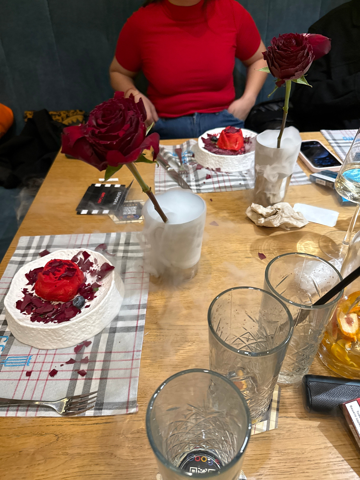 This photograph captures an inviting indoor scene, likely a cafe or restaurant in Sofia, Bulgaria, set around a warm wooden table. The ambiance suggests a special occasion or social gathering, possibl…read more