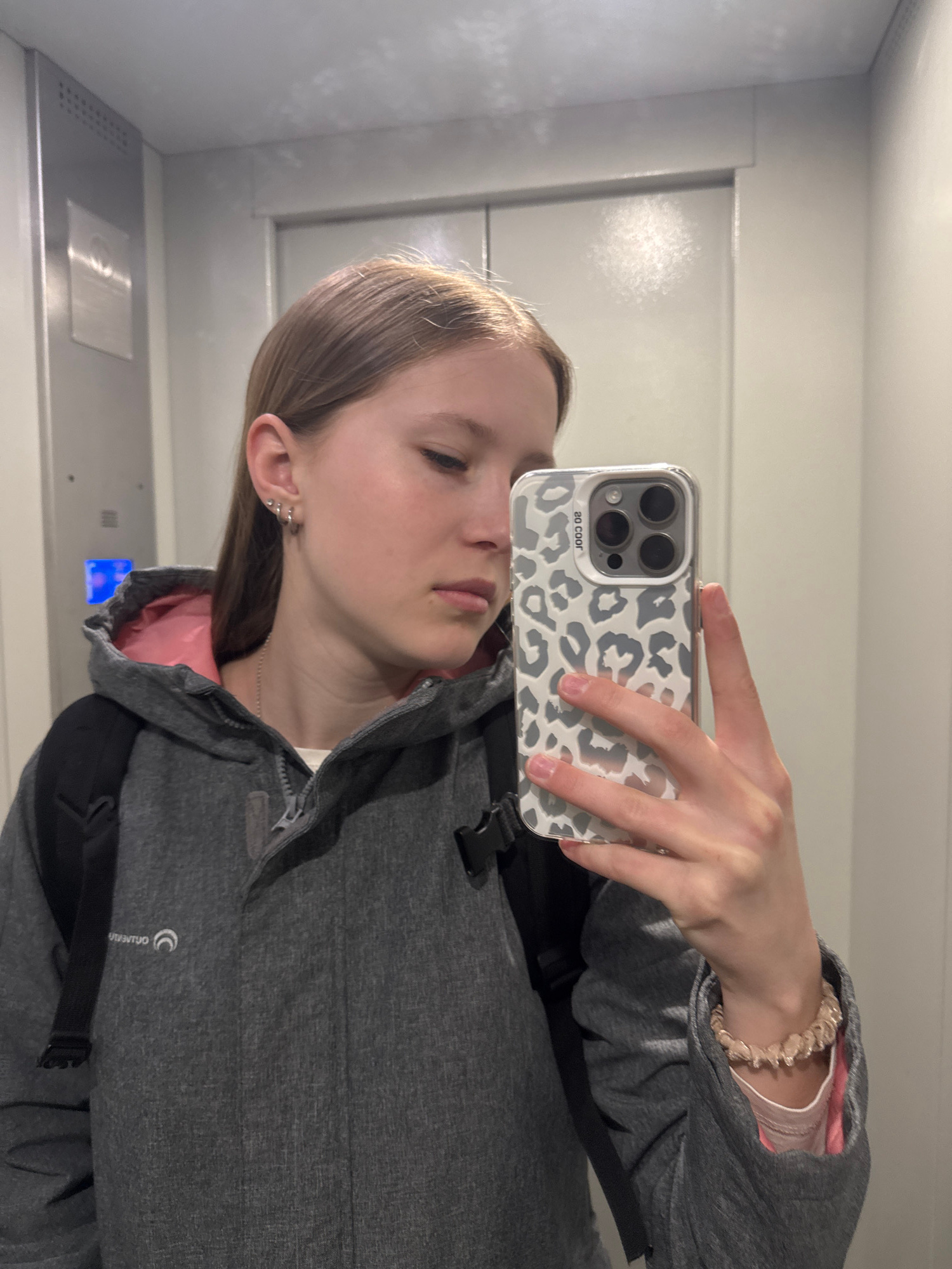 A young person is depicted taking a mirror selfie indoors, in Chaikovsky, Russia. The image is rotated, with the subject's head on the left. They hold a smartphone with a distinctive grey and white le…read more