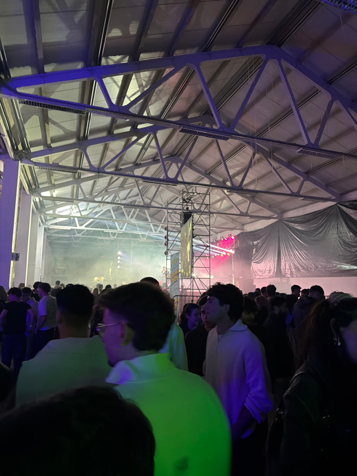 The scene depicts a large indoor event, likely a concert or party, located in Bragança, Portugal. The environment features a high industrial-style ceiling with exposed metal trusses, beams, and a corr…read more