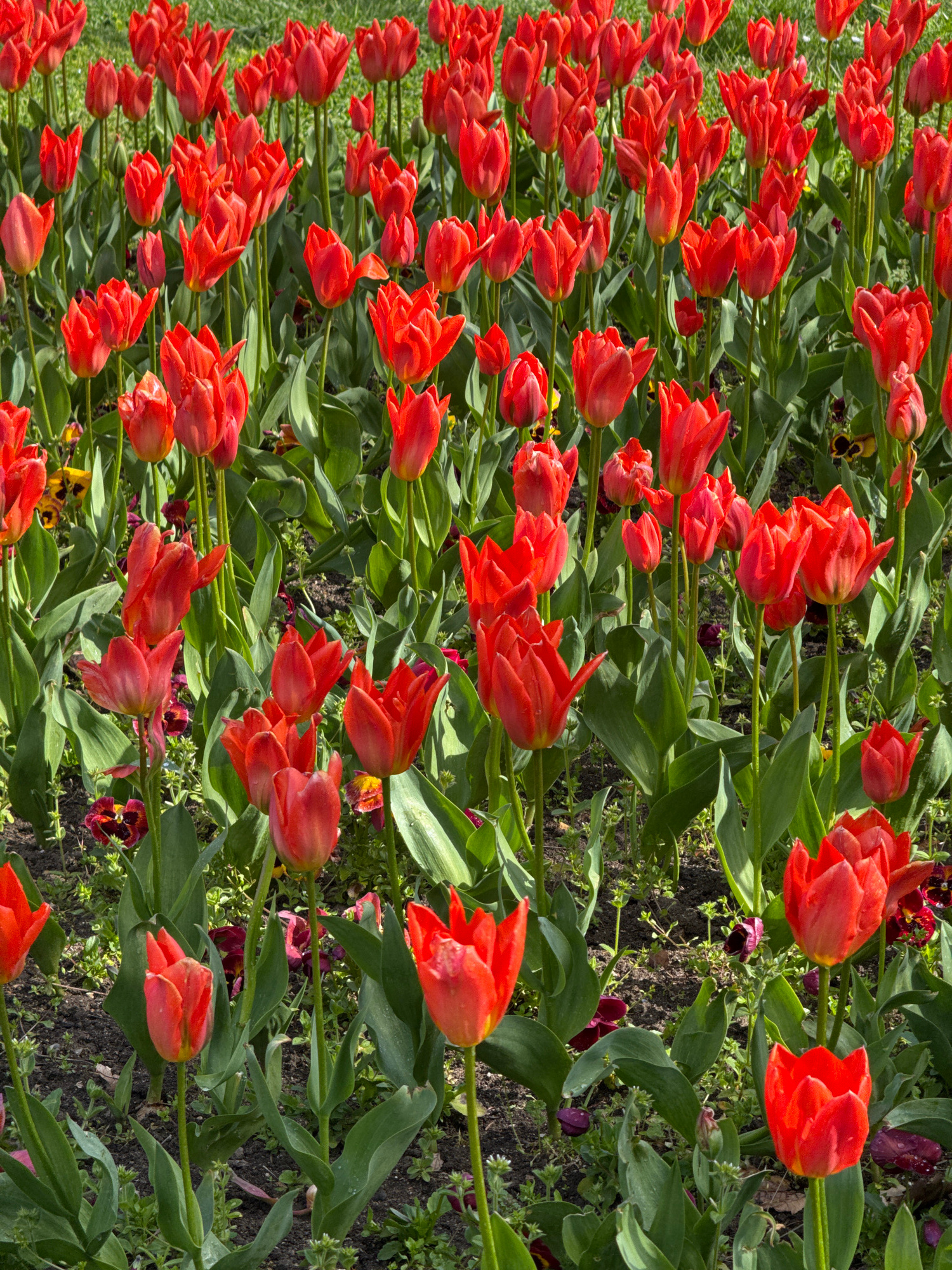 The image captures a vibrant and extensive display of numerous red tulips in full bloom, populating a meticulously arranged flower bed. Hundreds of individual tulips, distinguished by their classic cu…read more