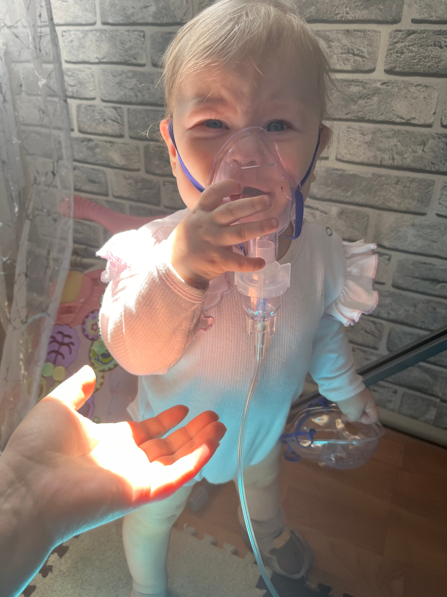 An overhead shot shows a young baby undergoing nebulizer treatment in an indoor setting. The baby, with blonde hair and blue eyes, is seen wearing a clear plastic nebulizer mask, secured with a blue e…read more