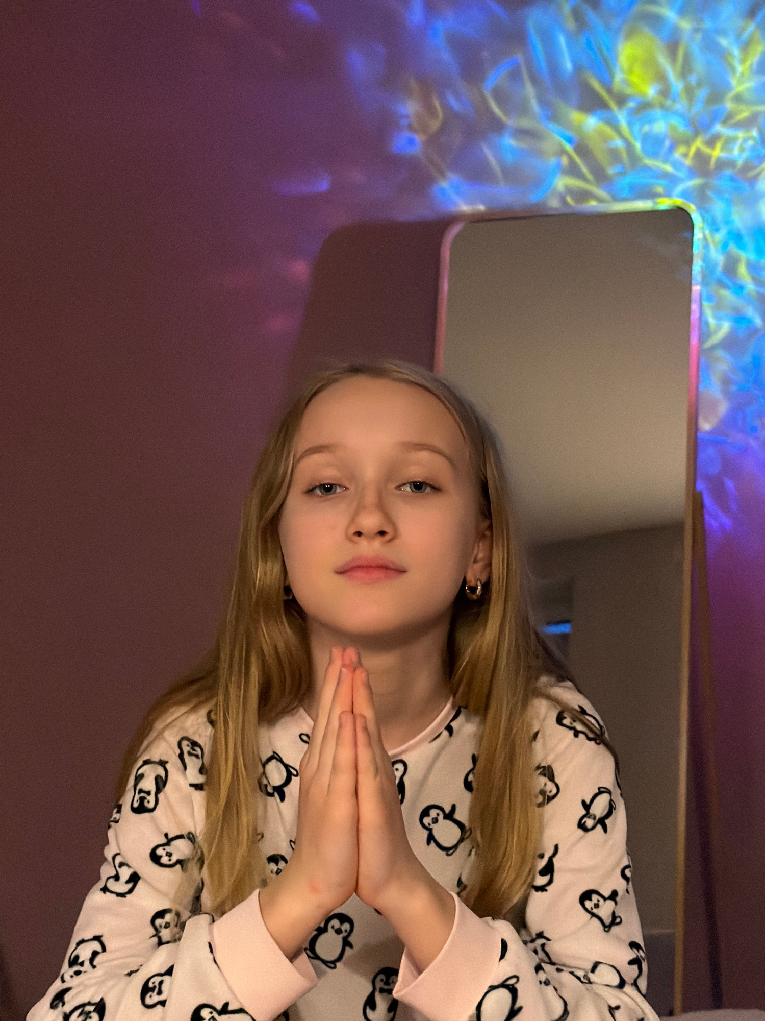 A young girl with blonde hair, wearing a white pajama top with a penguin pattern and pink cuffs, is posing with her hands together, palms facing each other. The background appears to be a bedroom sett…read more
