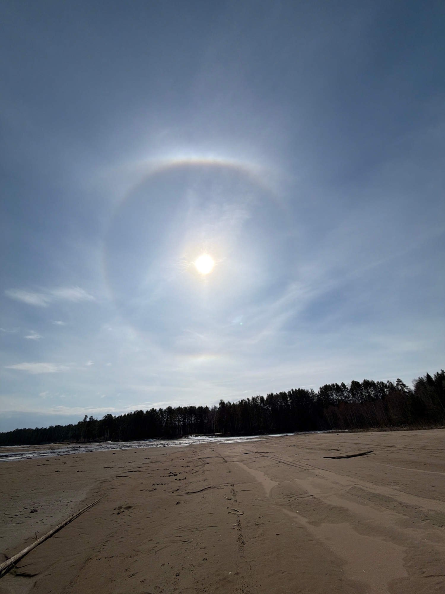 The image, taken in Chaikovsky, Russia, shows a 22° halo around the sun in a partly cloudy sky. The halo is a bright ring of light that circles the sun. To the right of the sky is a beach with a line…read more