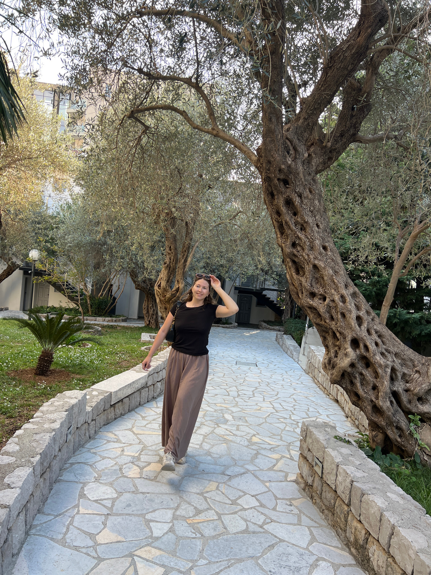 A young woman stands in a garden path in Petrovac na Moru, Montenegro. She is positioned on a light-colored stone path with stone borders, wearing a black t-shirt and brown pants. Her left hand is rai…read more