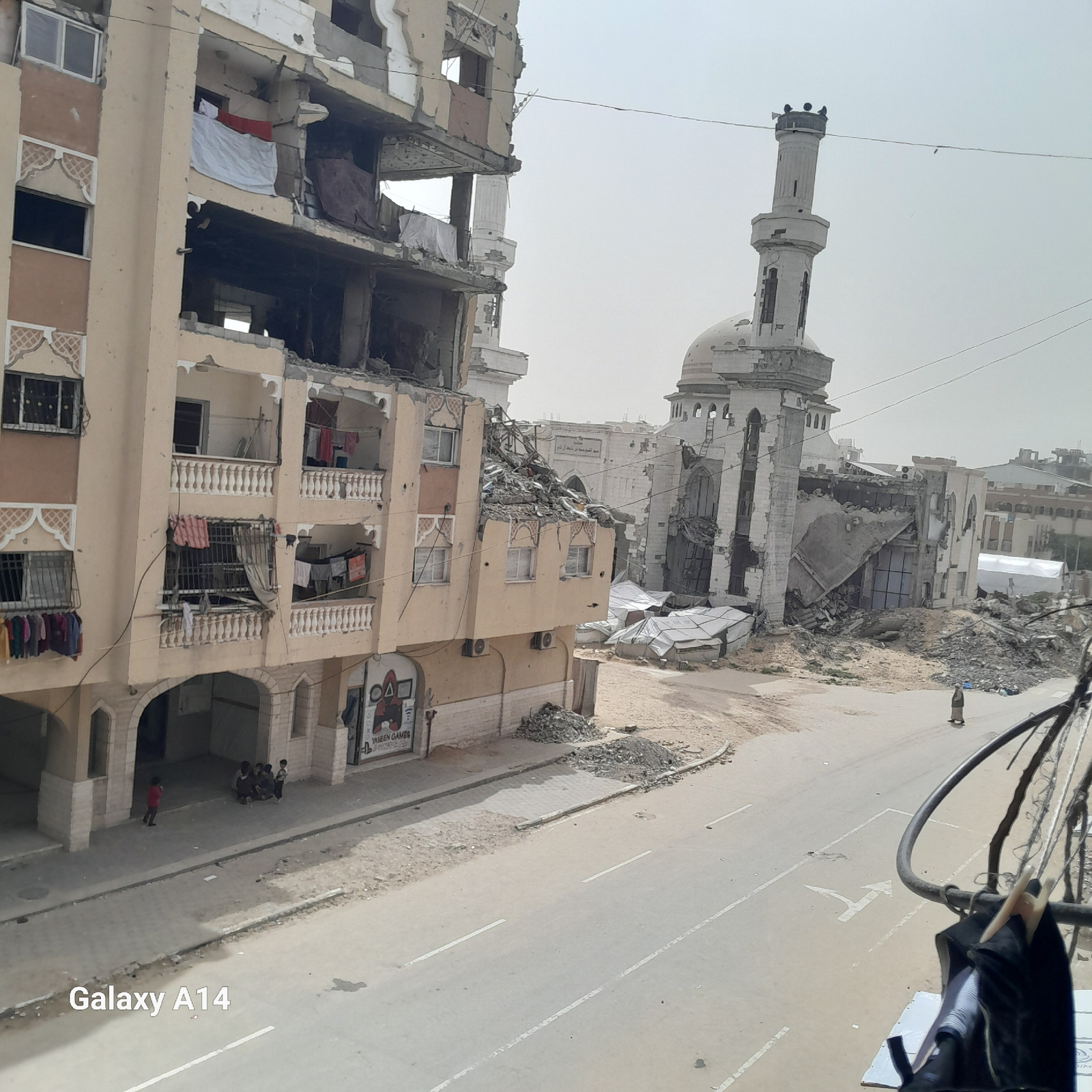 The image shows extensive damage to buildings and infrastructure in Khan Yunis, Palestinian Territory. A mosque and adjacent apartment buildings are heavily damaged. The apartment buildings show colla…read more