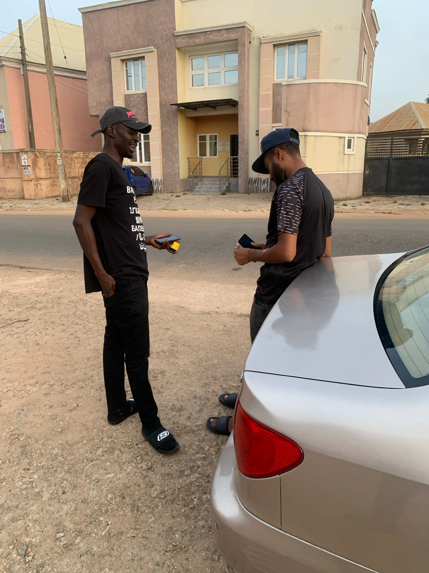 Two men are standing near a silver car in a residential area. One man, wearing a black t-shirt, black pants, and a black cap, is standing and holding a yellow object in his hand. The other man, wearin…read more