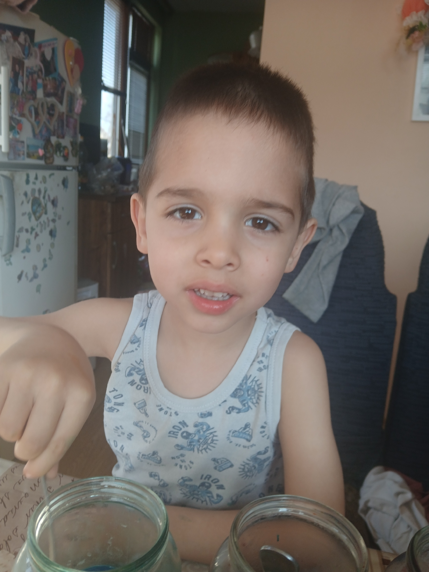 A young boy sits at a table. The table has two glass jars. The boy wears a white tank top with blue designs. In the background are a window, a refrigerator with magnets, and a gray chair. The location…read more