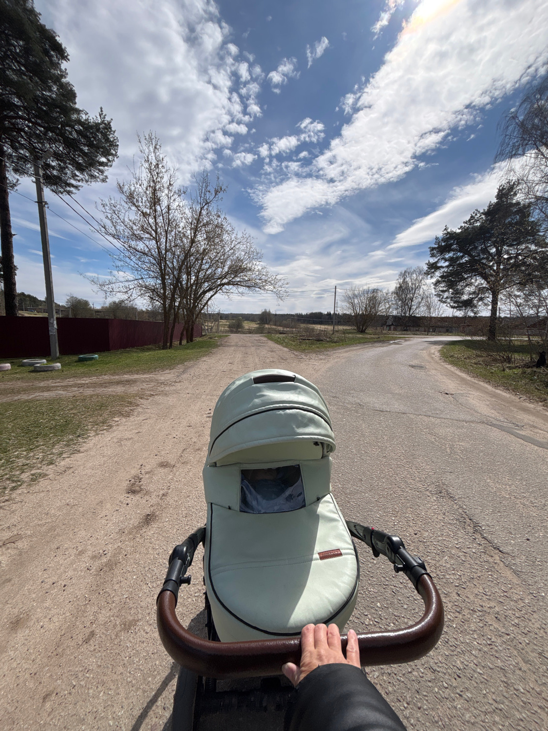 An outdoor, eye-level shot, taken from a first-person perspective, captures someone pushing a baby stroller along a dirt or gravel road in Раздолье, Russia. The image is rotated counter-clockwise, sho…read more