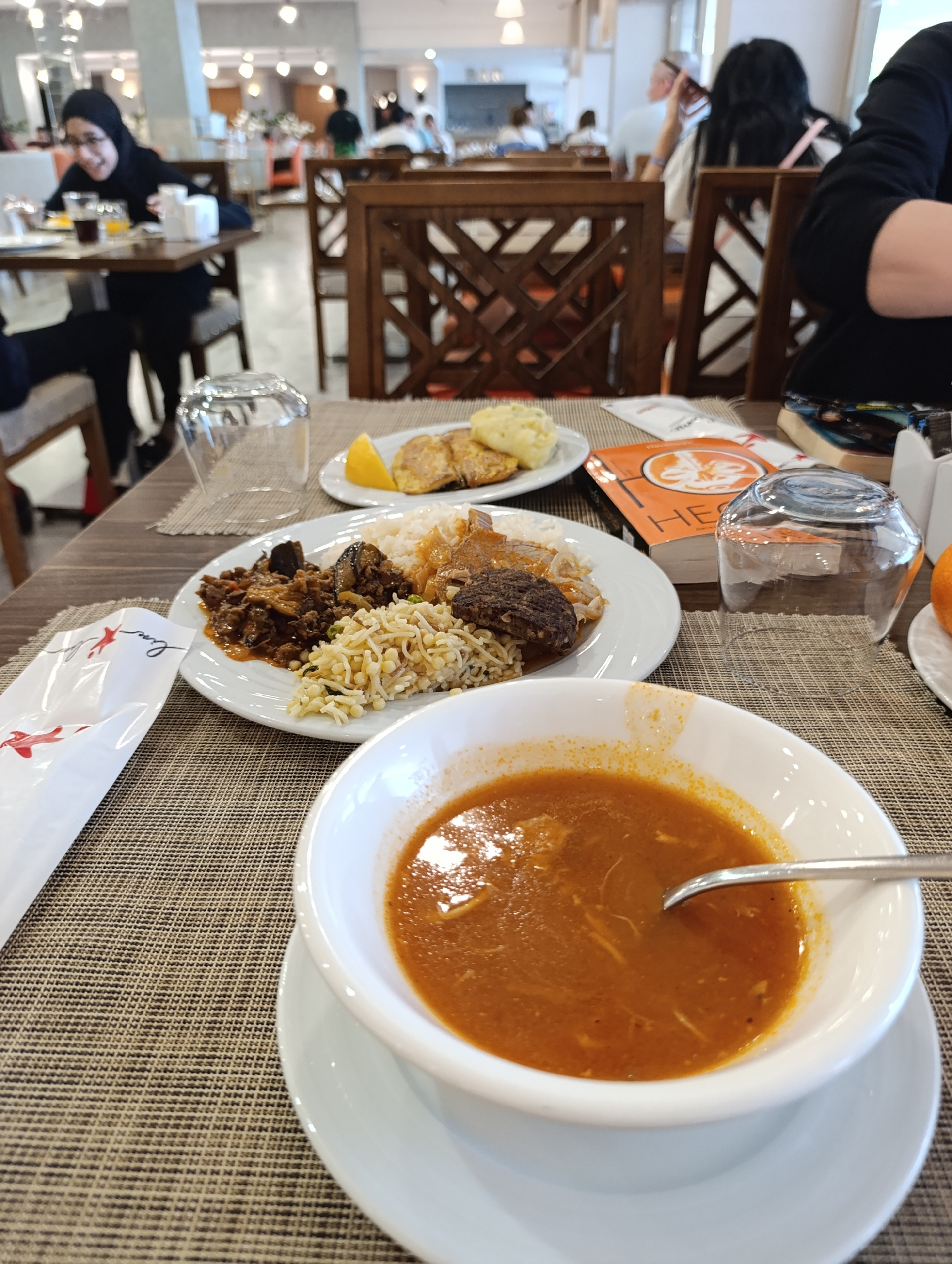 The image captures a dining scene at an establishment, possibly a hotel or restaurant, based on the buffet-style setup visible in the background. Several people are present, dining at tables. In the…read more
