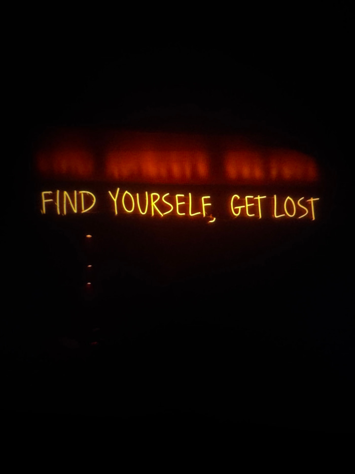 The image displays a dark, high-contrast scene, dominated by glowing text in a vertical orientation. The background is almost entirely black, suggesting a low-light environment, possibly night. The cā¦read more