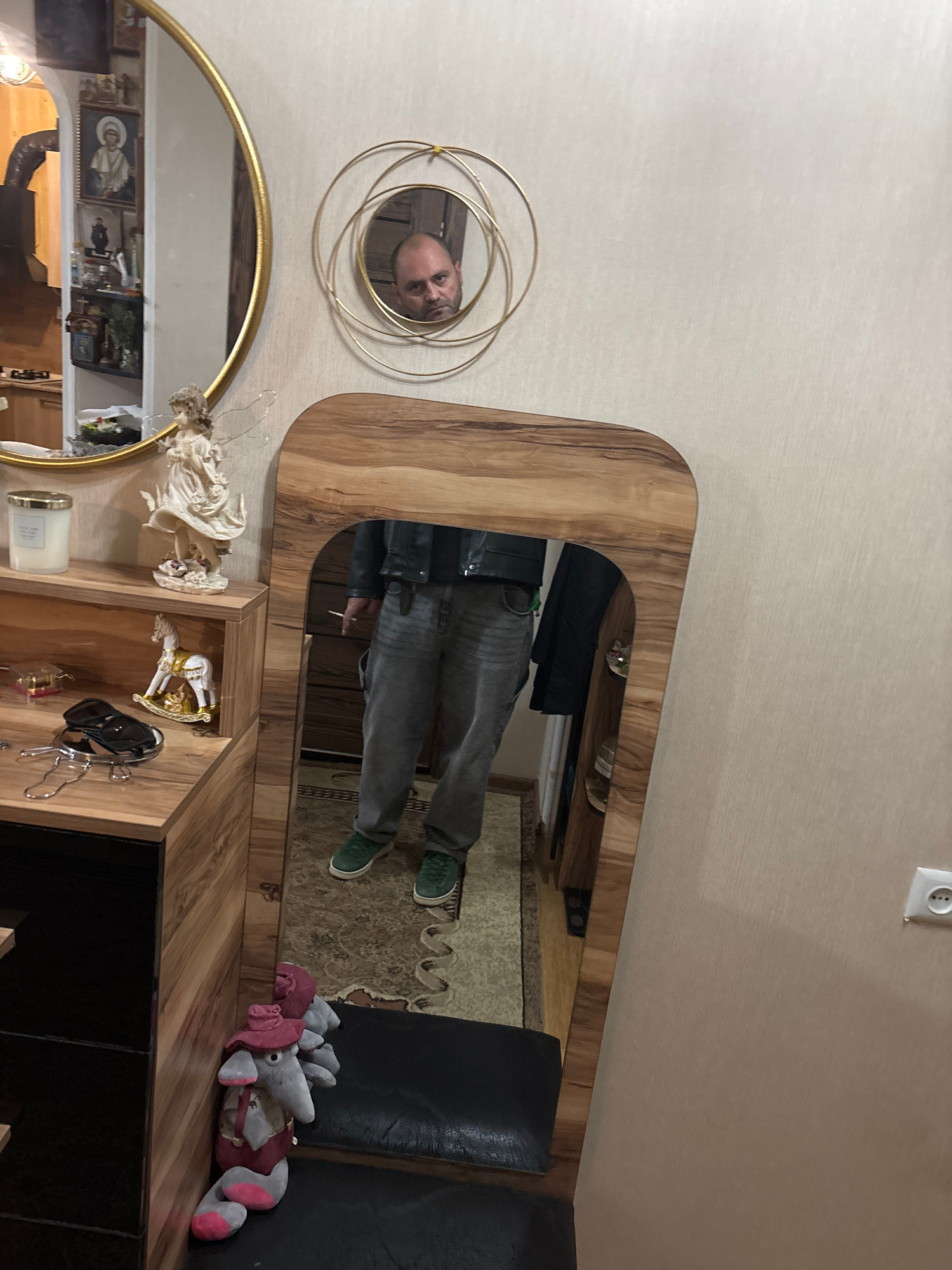 A person's reflection is visible in a mirror on a wooden cabinet. A circular mirror is on the wall, with the head of a man reflected in it. A larger, gold-framed circular mirror sits below. On the cab…read more