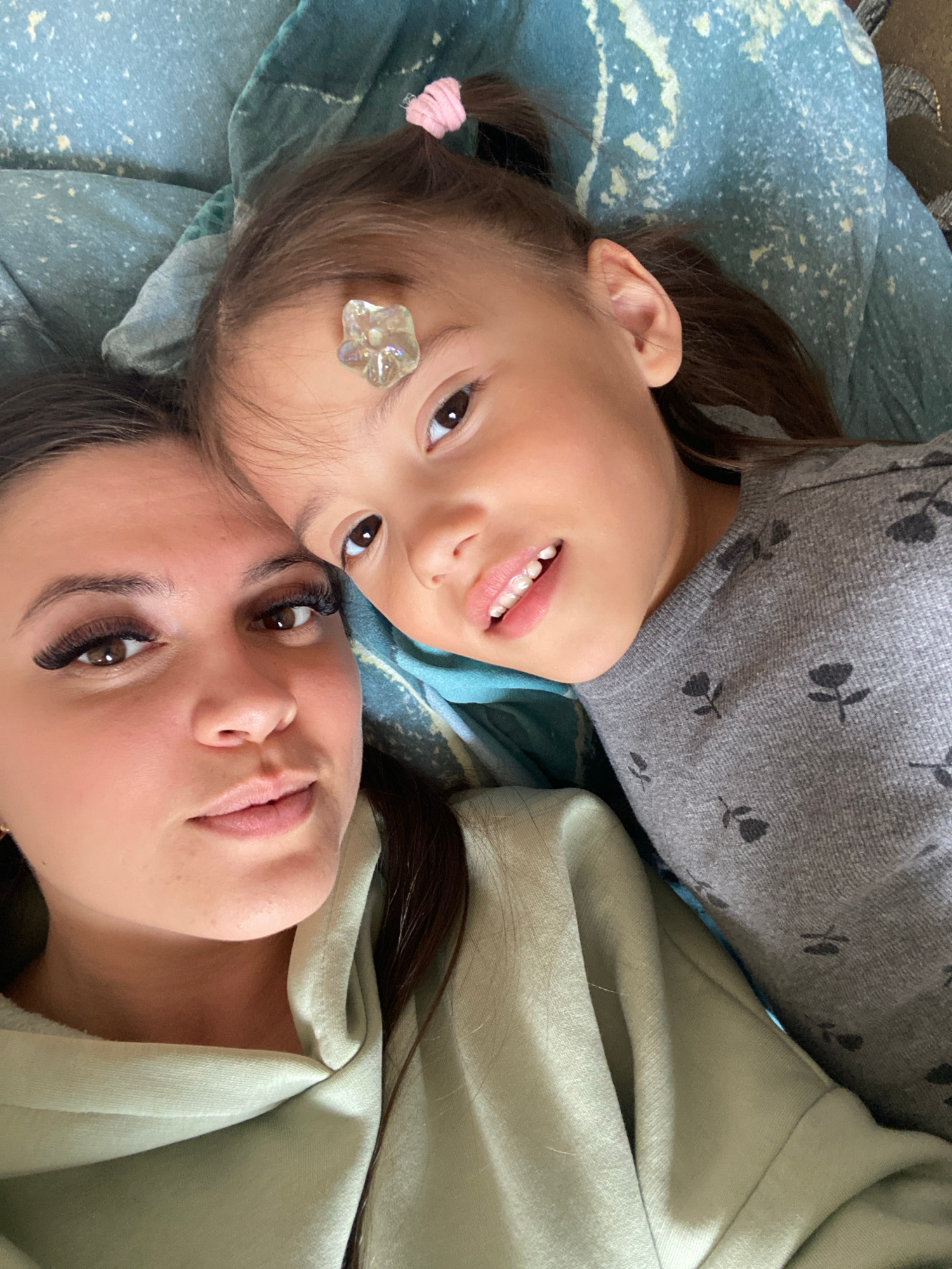 A close-up captures a woman and a young girl lying on a blue, patterned blanket. The girl, positioned at the top of the frame, has a decorative flower-shaped gem adhered to her forehead. A pink hair tβ¦read more