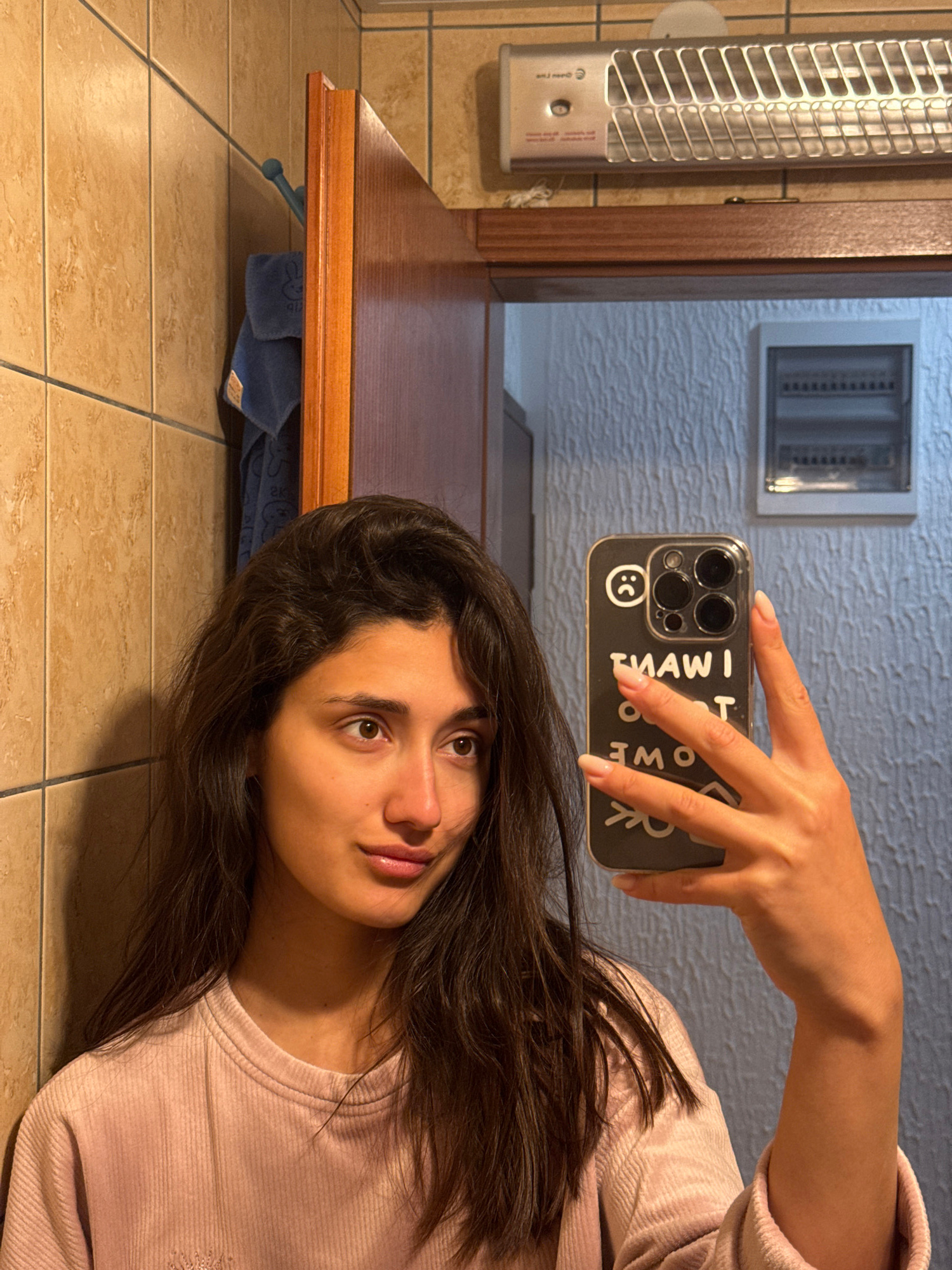 A young woman is taking a selfie in a bathroom. She is lying on the beige tile floor and is holding a black iPhone with a clear case that has white writing and a smiley face on it. She is wearing a li…read more