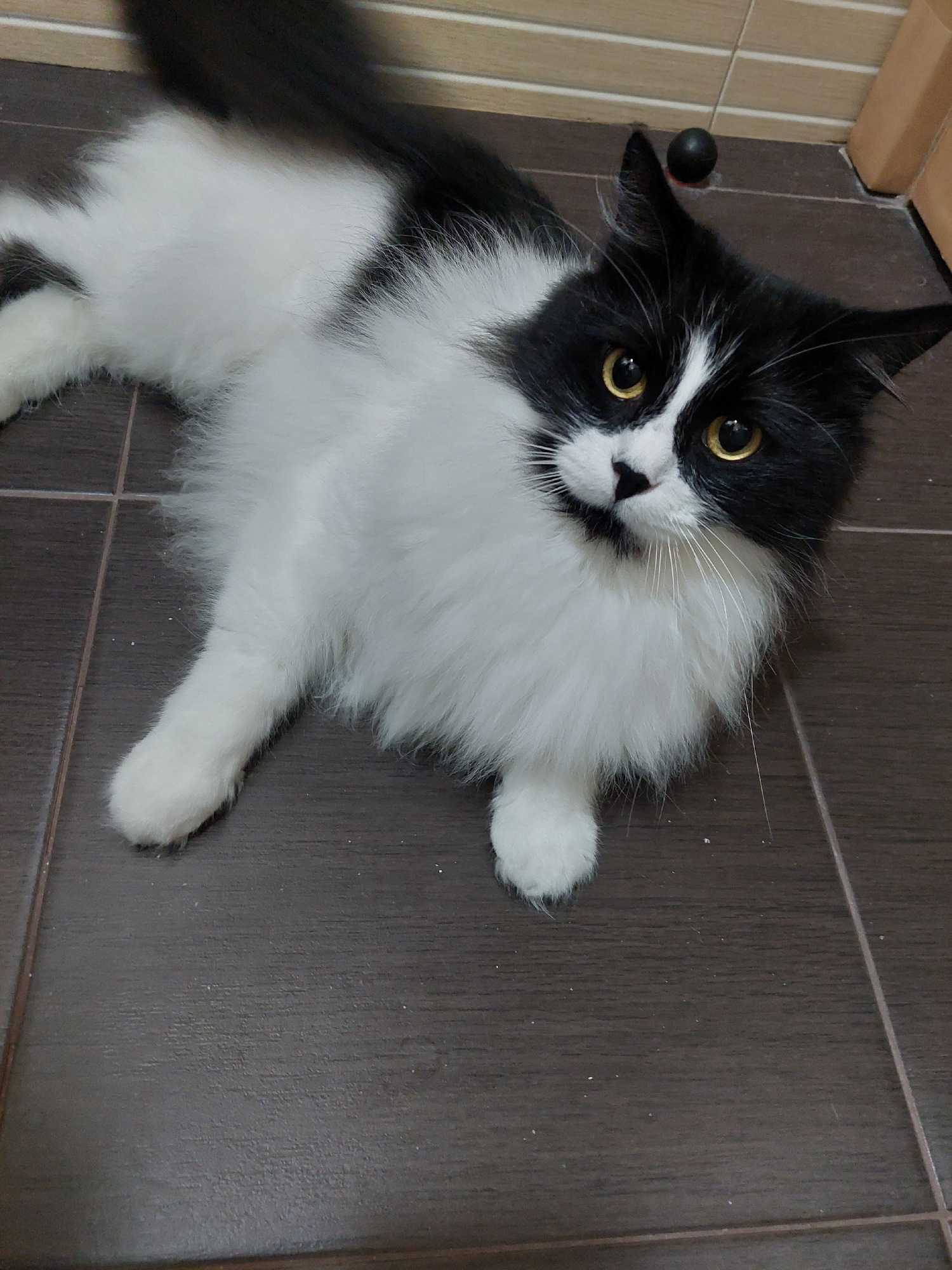 A black and white cat with yellow eyes lies on a tiled floor. The floor tiles are dark brown with light grout. The cat's head is tilted toward the camera. A black sphere is visible next to the tiles a…read more