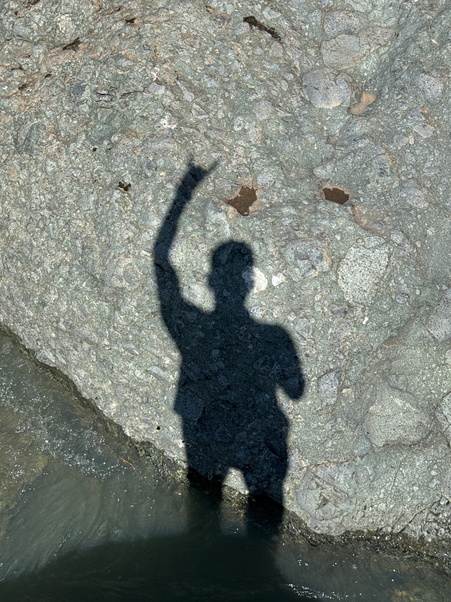In Fazanovo, Bulgaria, an overhead perspective reveals the distinct shadow of a human figure projected onto a textured, light-colored rock formation bordering dark water. The shadow's left arm is rais…read more