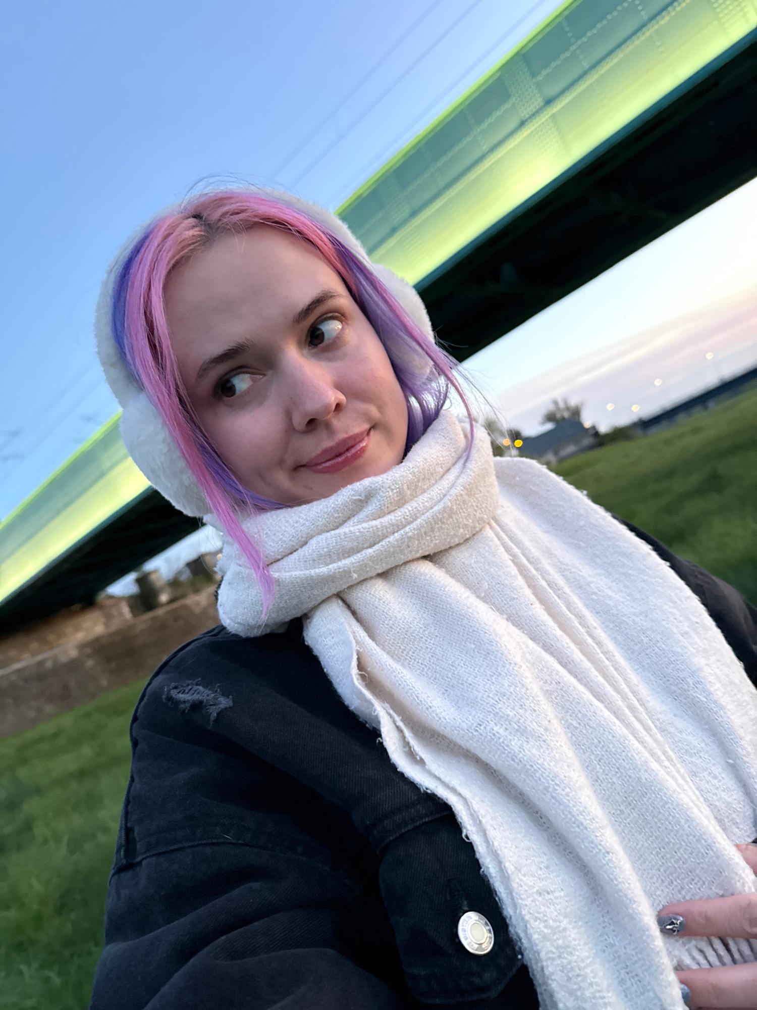 A woman with dyed purple and pink hair is wearing a white ear-covering hat and a white scarf. She is also wearing a black jacket. The background shows a blue sky and green grass. A structure with gree…read more